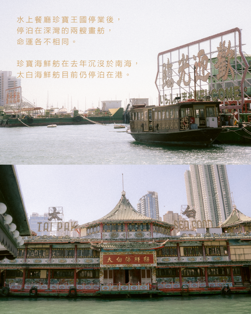 去年,隨着水上餐廳珍寶王國停業,停泊在深灣的兩艘畫舫,即珍寶海鮮舫和太白海鮮舫,命運各不相同。珍寶海鮮舫在去年拖離香港時,在南海一帶遇上風浪,被海水灌進船內並開始傾側,最終沉落海底;至於後者,太白海鮮舫目前仍停泊在港,並有新經營者接手,將在明年秋季重新開業。