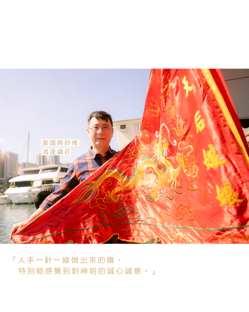 回想起年輕時,黃師傅坦言一年至少做一千幾百枝旗,而且傳統做旗是甚少使用全機器打印,他解釋:「人手一針一線做出來的旗,特別能感覺到對神明的誠心誠意,更能得到神明的庇佑。」