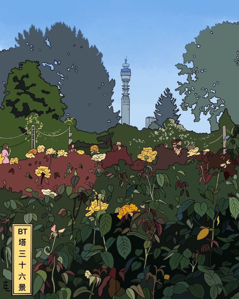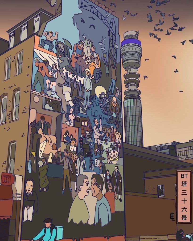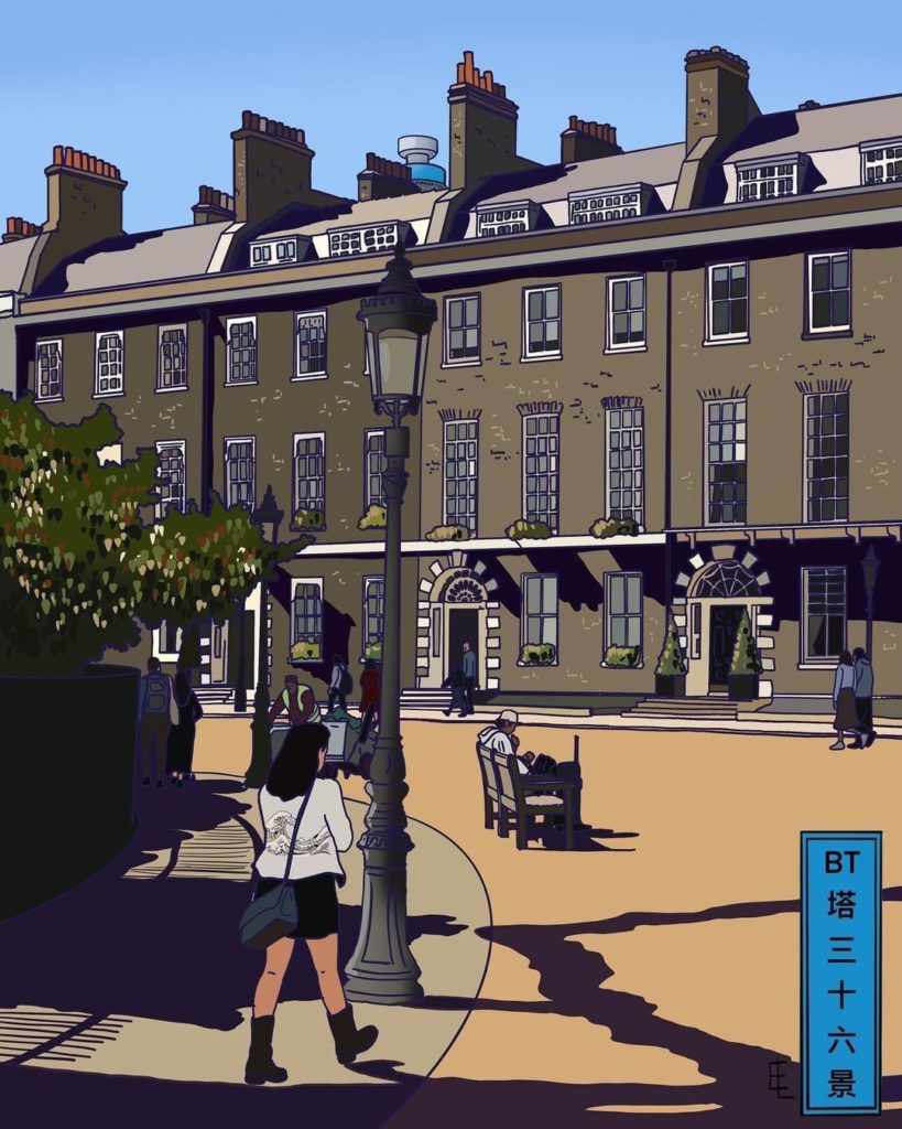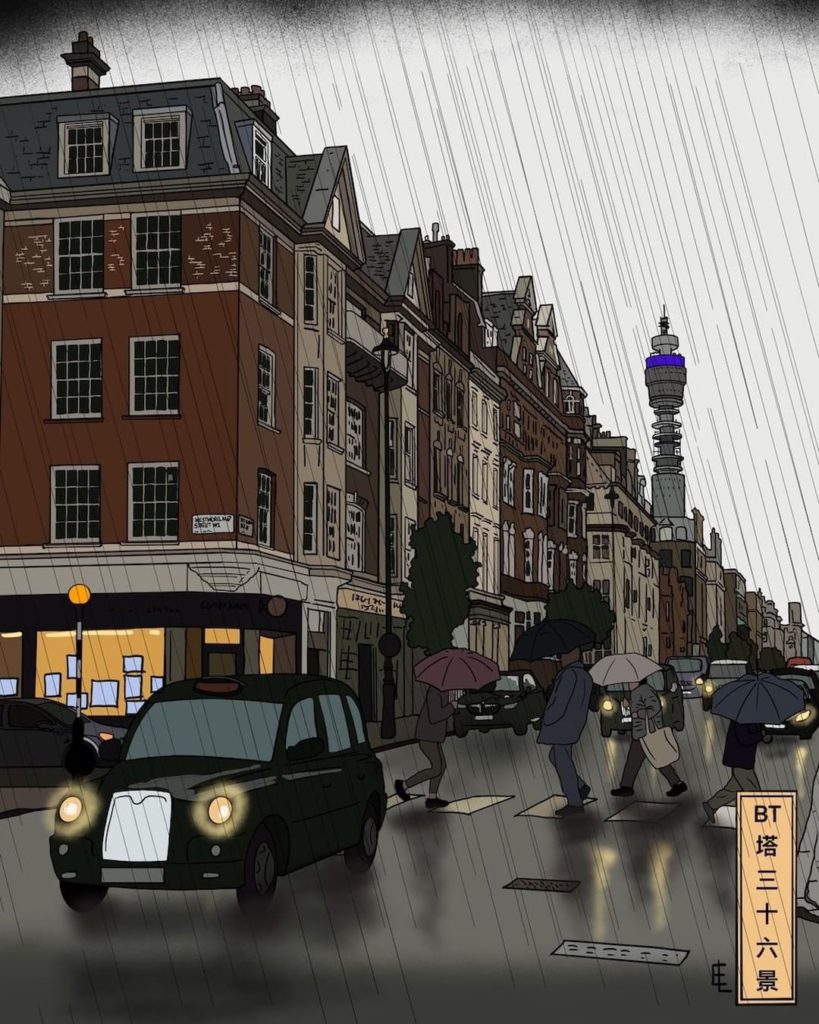 如果可以再去外地旅行,你喜歡總依戀雨點的倫敦,還是要把富士山私有的日本?還是兩樣都要,來個日本英國MIX!英國藝術家Edward Luper(劉華)以浮世繪風格製作出英國大街小巷的日常百態,令電信塔附近的街道有了幾分日本的感覺。