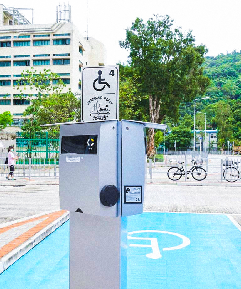 電動車在香港越來越普及,車主在駕駛途中偶然都需要為其電動車補充電力,梅窩的政府戶外公共停車就安裝了3支中速充電器,每支各有 3 個充電器的支架,可以同時為 9 輛車叉電,是全港首個露天錶位電動汽車充電站。相比傳統的標準充電器,中速充電器可大幅減少充電時間近6成。負責工程的本地科技公司 Cornerstone technology 表示,充電支架有一定的防水能力,可以抵擋日曬雨淋,保持充電站正常運作。