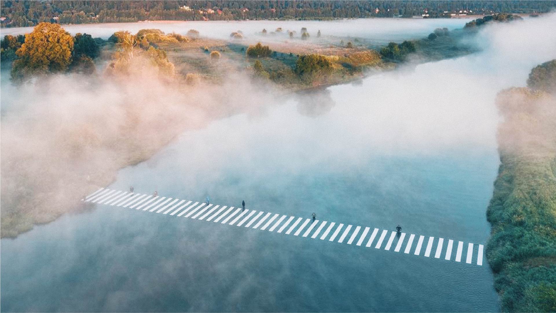 如果馬路上的斑馬線讓你走路更小心,在河流上加一條斑馬線又會不會讓你對環境更謹慎?俄羅斯藝術家 Gregory Orekhov 最近在莫斯科河裝置了一條巨型斑馬線「Crossroads」,在河水流經的農地之中飄浮起來,彷似田野之間的橋樑,呼籲大眾關注莫斯科河開發計劃。 藝術裝置以塗上白色顏料的聚碳酸酯板組成。Orekhov 指出,十字路口象徵了「選擇」和「命運的轉折」,當河水與農地交織,保育土地遇上城市發展,「引起了當地居民的諸多不滿」。當「越來越多土地因經濟發展而被破壞」,他希望藉「Crossroads」引起世界對保育議題的關注。 Photo/ IG @gregory.orekhov