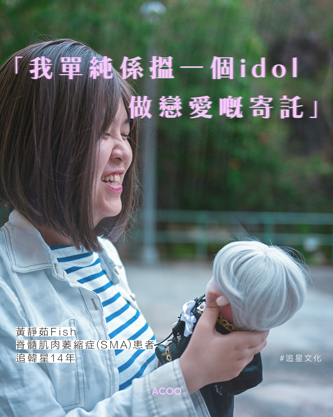 按下播放鍵,一把溫柔、略帶沙啞的歌聲在空中迴盪,歌詞句句像是在撫慰着聽者的心靈。患有脊髓肌肉萎縮症(SMA)、26歲的黃靜茹(Fish)追韓星14年,佔她人生超過一半的時間。從中學時期被Super Junior帥氣的外表吸引,開始「入韓圈」,到接觸到男團B1A4,後來因選秀節目認識「國民男友」姜丹尼爾(Kang Daniel),他的一顰一笑更是叫她傾心。她說,Daniel是她的「戀愛寄託」,「我單純係搵一個idol做戀愛寄託,咁樣我就唔會恨拍拖。」