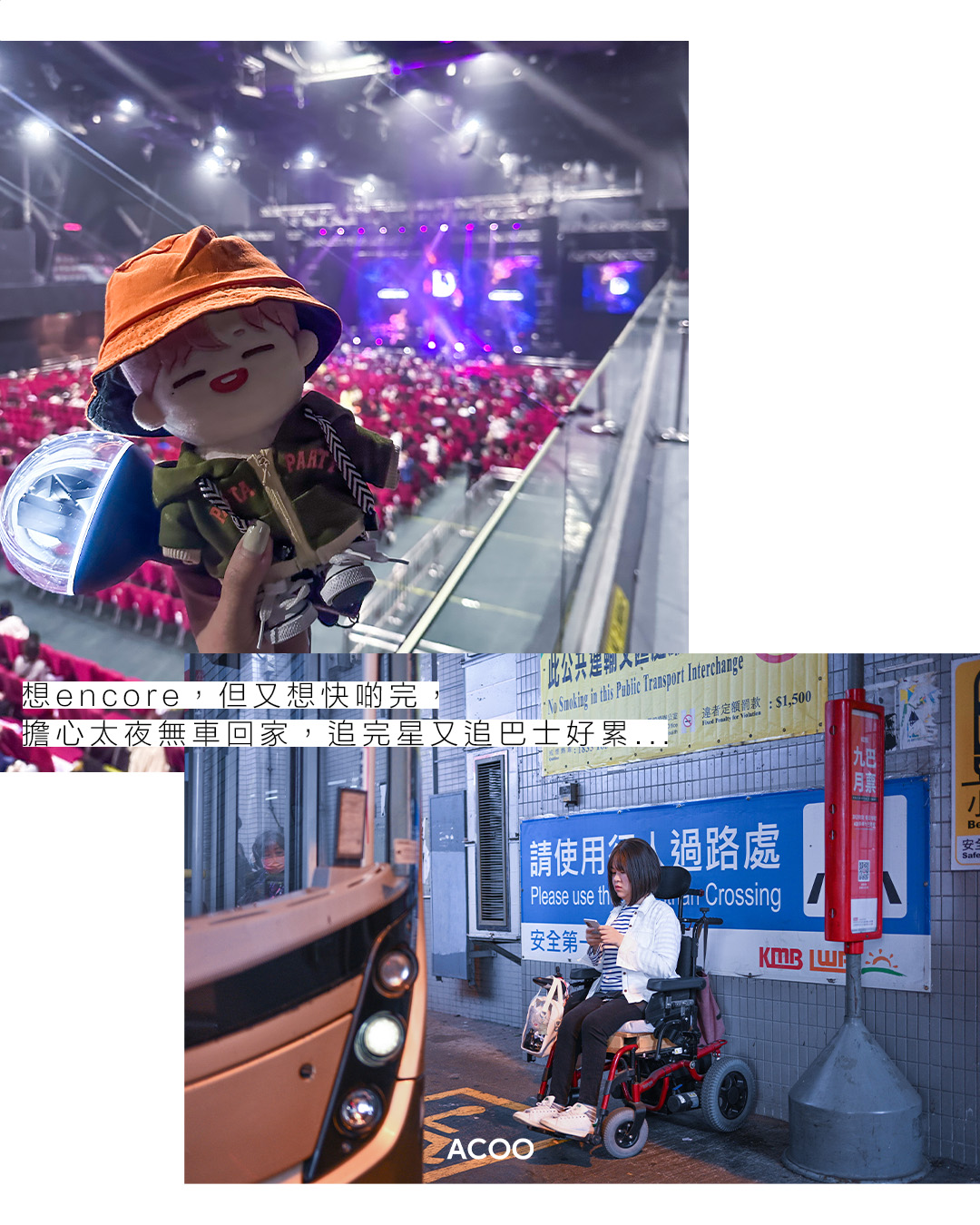 居於葵青區的Fish,日常出入習慣乘搭巴士。在追星的路上,於她而言最棘手的是處理交通問題。演唱會開場前,正當別的粉絲可輕輕鬆鬆享用晚餐,再一手握着燈牌、另一手拿起應援橫幅,興奮入場的時候,Fish卻是在研究着自己前往會場的交通方法,「去亞博嘅話,可以去葵芳搭E車,但要兜路,或者地鐵到東涌,再轉巴士,要好好計劃」;當其他粉絲大叫「Encore」,Fish內心卻是一陣矛盾,「想encore,但又想快啲完,擔心太夜無車返屋企,追完星又追巴士好累……」