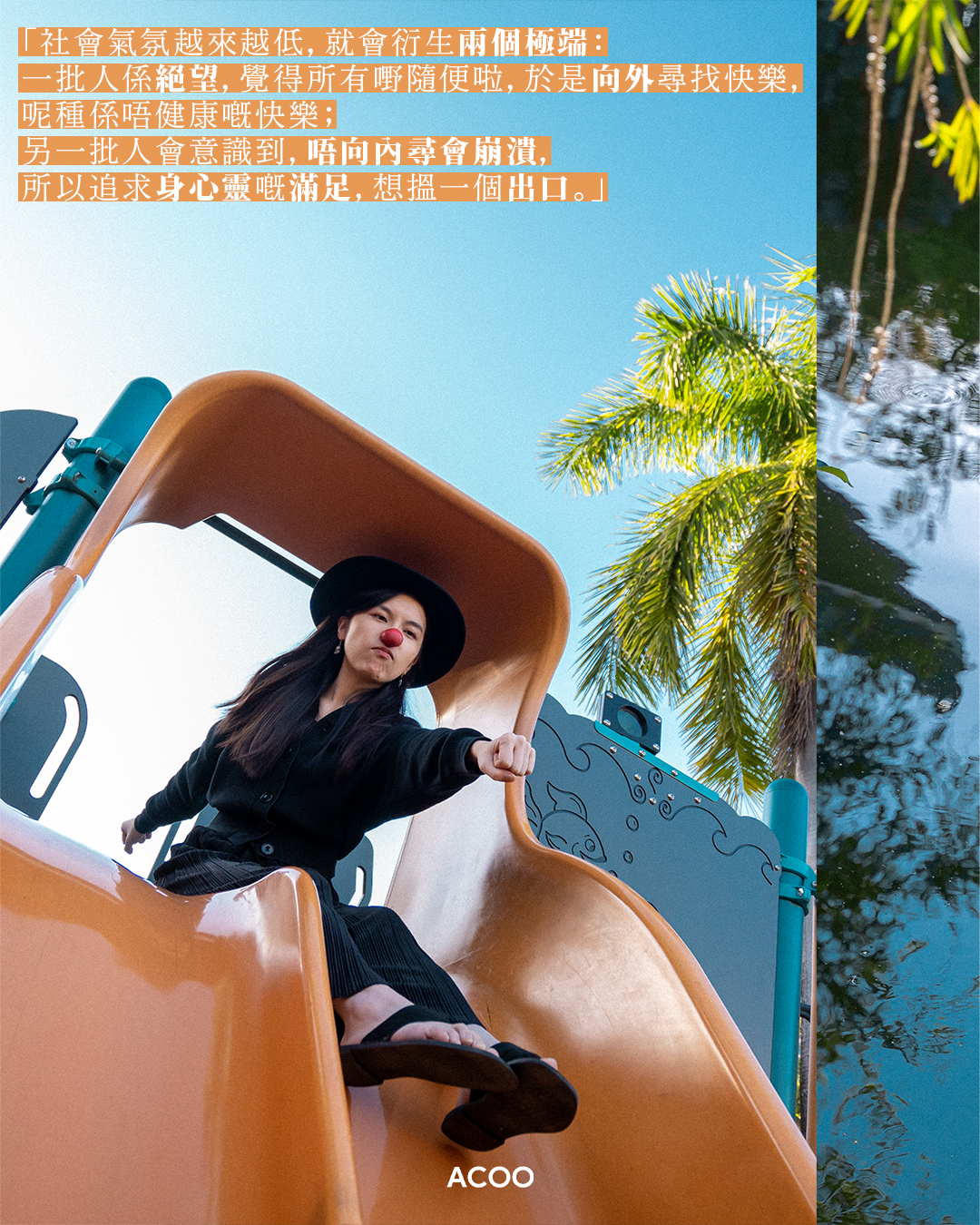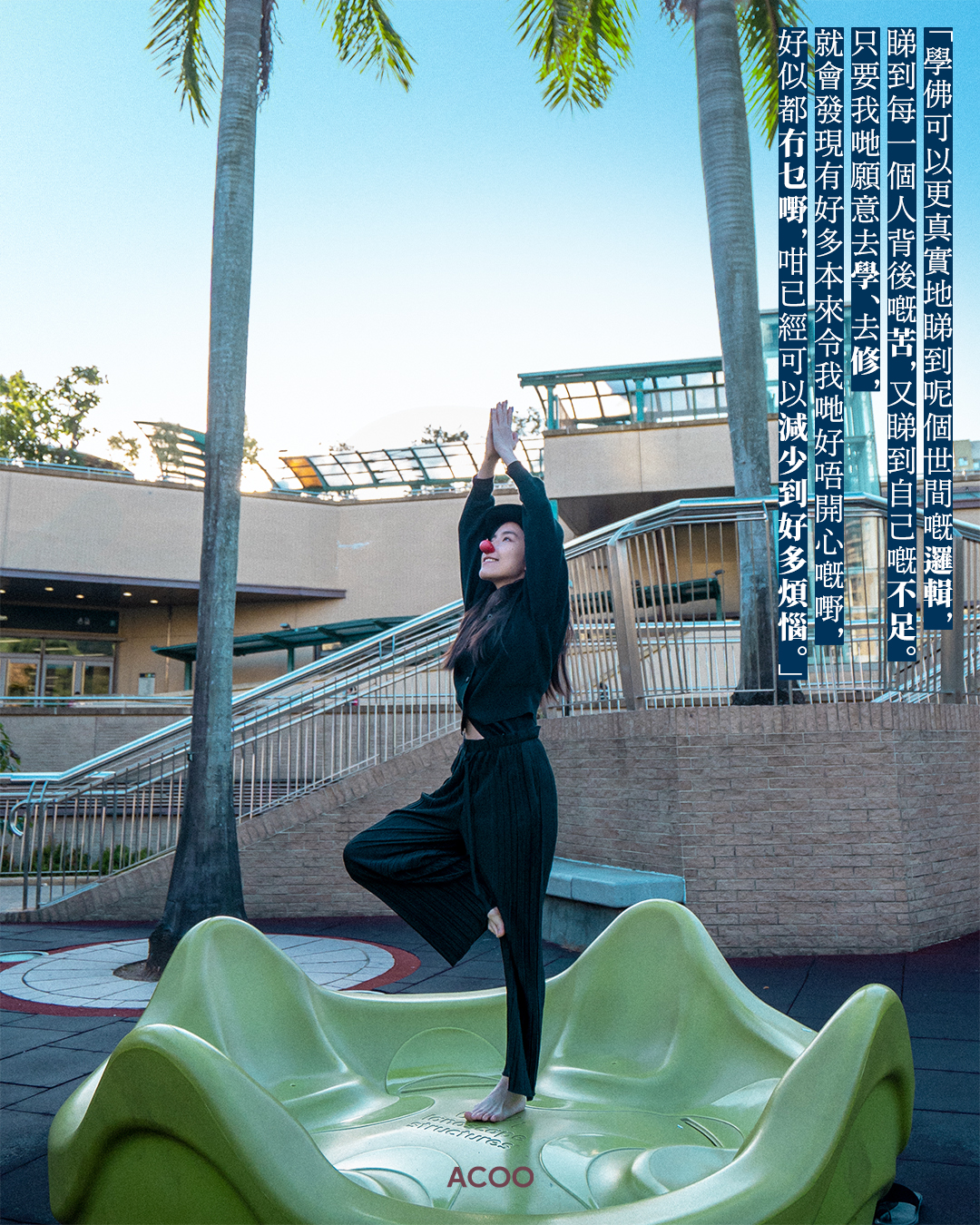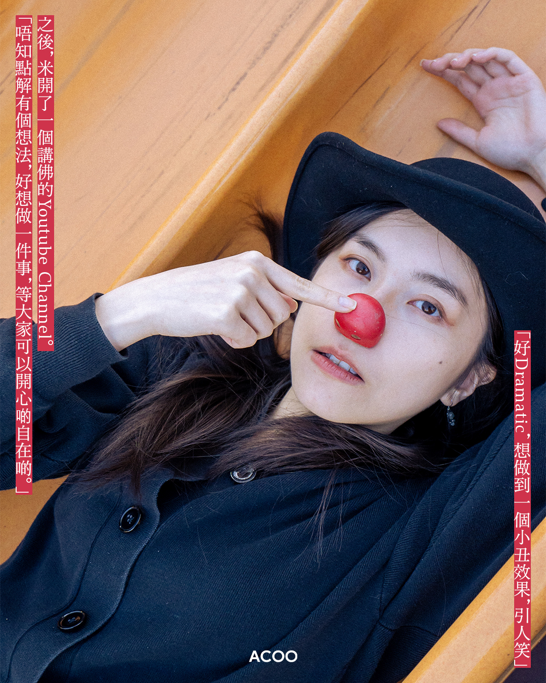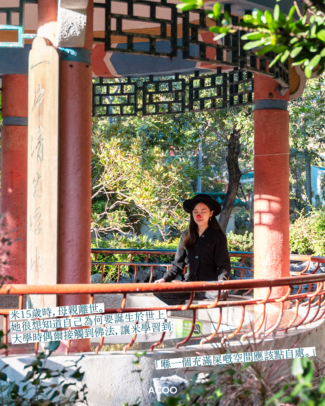 這個25歲女生,每周都會頂着一個紅色小丑鼻子,在客廳淡黃色窗簾前的一隅拍片講佛。人生軌跡與佛相交,或是源於米年少時的苦難:她在中學時期喪母,其後開始苦苦追尋人生意義。在大學讀哲學但仍找不到答案的時候,佛學像一個慈祥的老爺爺現身在米眼前:「喺哲學好似畀屎我食嘅時候,佛係呵返我——唔係話佛陀愛我,就會幫我處理一切,而係佢令我知道,我可以自己決定命運」。