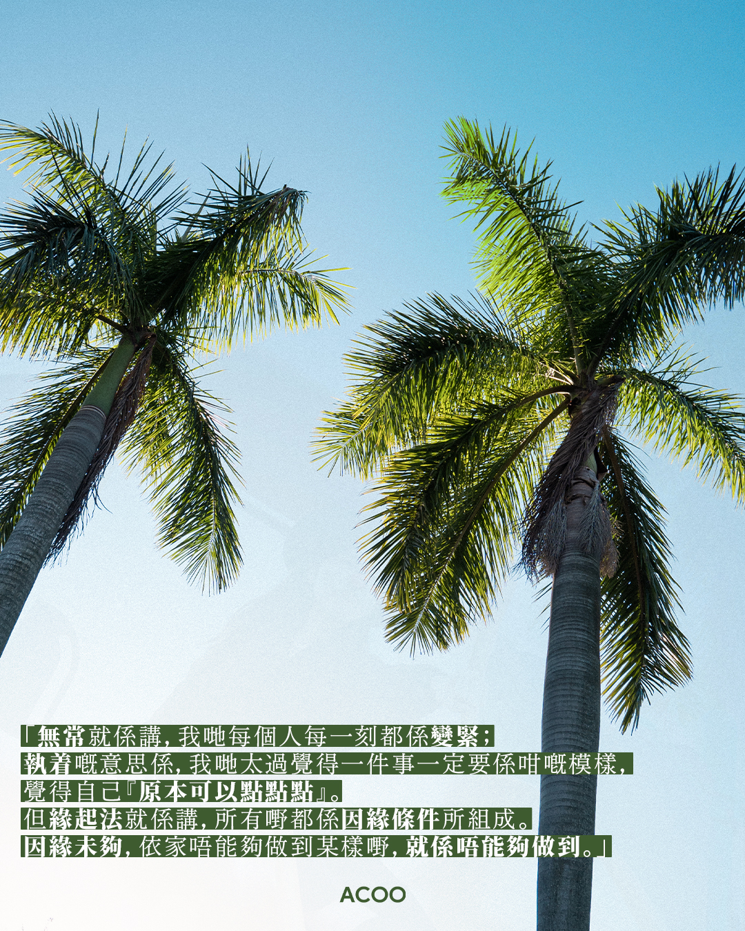 近年的社會事件,以至持續3年多的疫情,都令香港人變得無比壓抑:「呢個說法好似好離地,但無常就係講,我哋每個人每一刻都係變緊;執著嘅意思係,我哋太過覺得一件事一定要係咁嘅模樣。覺得自己『原本可以點點點』。但緣起法就係講,所有嘢都係因緣條件所組成。因緣未夠,依家唔能夠做到某樣嘢,就係唔能夠做到。」
