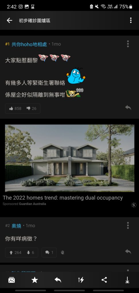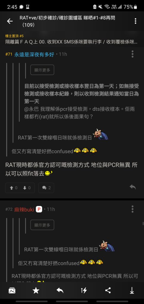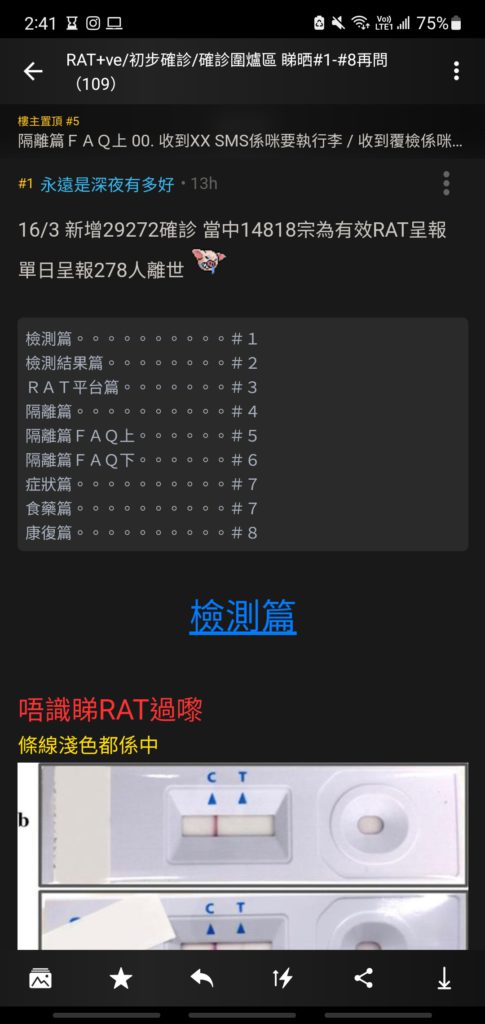 「RAT+ve/初步確診/確診圍爐區 睇晒#1-#8再問 」一開始post名為「初步確診圍爐區」。是在今年2月28日,由一位正在居家隔離的確診者開的post。原意本是「圍爐取暖」,跟一樣中招的人討論為何會確診,誰不知一直有不同網民,在每一個post爆滿後再幫忙開新post。而在每次的討論中,網民們都會各施其職去解答大家的「疑難雜症」,慢慢地就建立了如此完整的疫情資訊了!