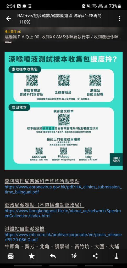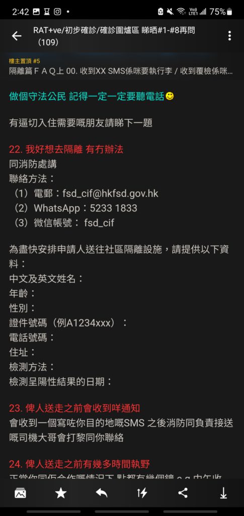 在最新的post文中,分別可以見到分了8個部分的資訊。檢測篇、檢測結果篇、RAT(快速測試陽性)平台篇、隔離篇、隔離篇FAQ上、隔離篇FAQ下、症狀篇、食藥篇及康復篇。當中圖文並荗,更有附上相關網站以便有需要人士使用,資料相當詳盡。當中就有網友提問:「確診了,很想被安排送往社區隔離設施可以怎樣做?」,樓主解答「聯絡消防處便可。」