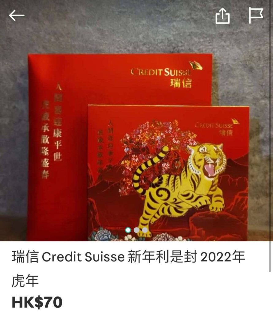 據《彭博》報道,香港各資銀行如瑞銀、瑞信推出的免費利是封,最近被放到二手買賣平台Carousell炒賣,有價有市。這些利是封一般由銀行送給職員及客戶,並不會公開發售。《彭博》統計發現,利是封炒價最高的是瑞銀,每個要$10;第二是瑞信,每封$6.2;第三位是摩根士丹利,每封索價$5.9。至於本地銀行代表滙豐,每個利是封要$4,排第6。