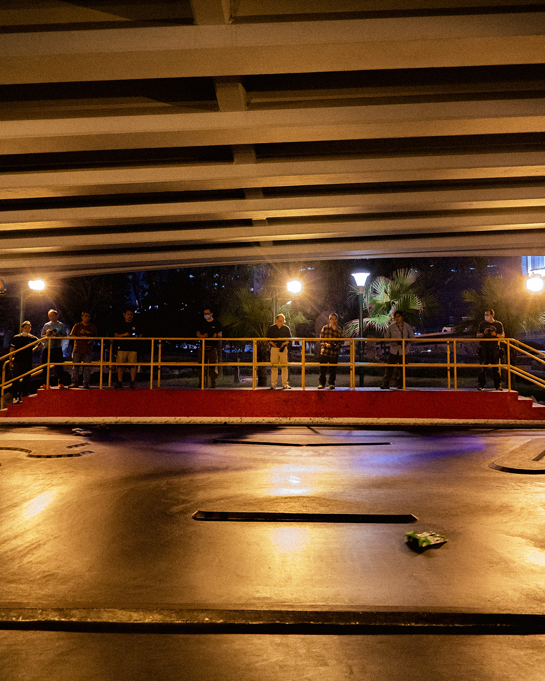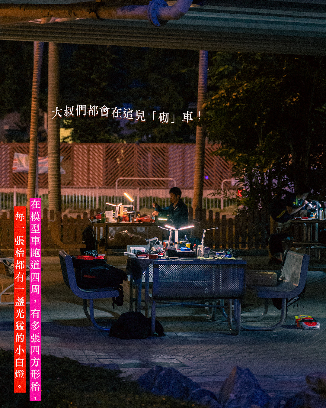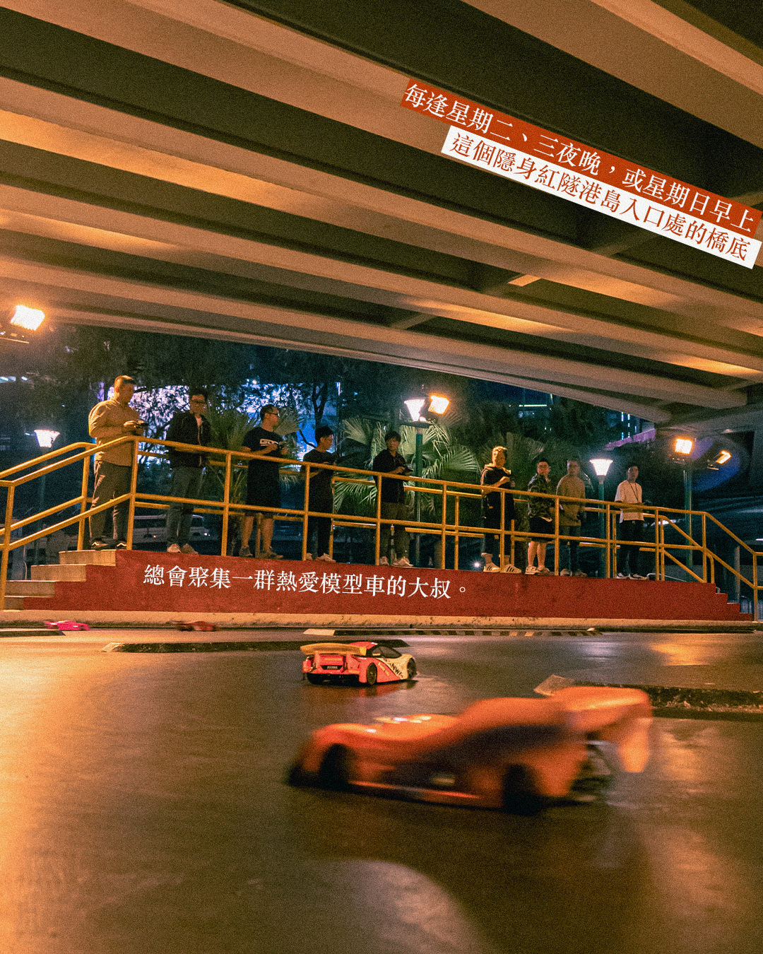 「啊!!」、「反車啦!」。一架架賽車在彎彎曲曲的賽道上風馳電掣地疾走,控制台上的大叔們,時而歡呼、時而大叫,但更多是肉緊地盯著賽道,手上拿著遙控,視線離不開自己的寶貝。香港目前有4個政府模型車場,其中一個隱身紅隧港島入口處的橋底。每逢星期二、三夜晚,或星期日早上,總會聚集了一群遙控車發燒友激戰一番。