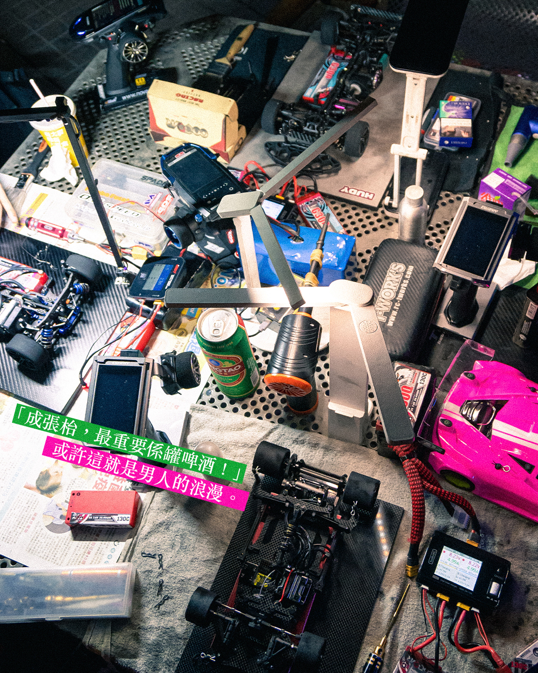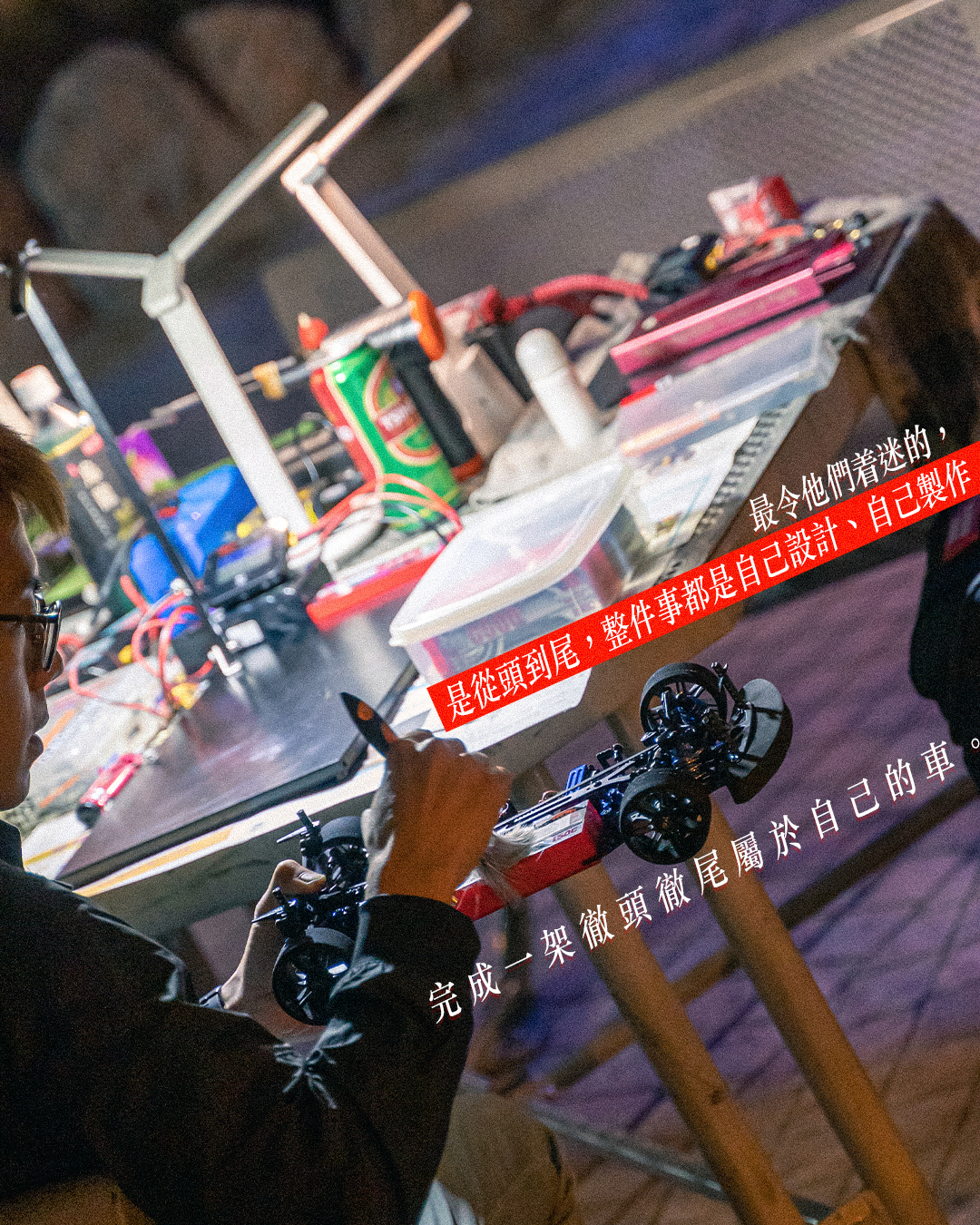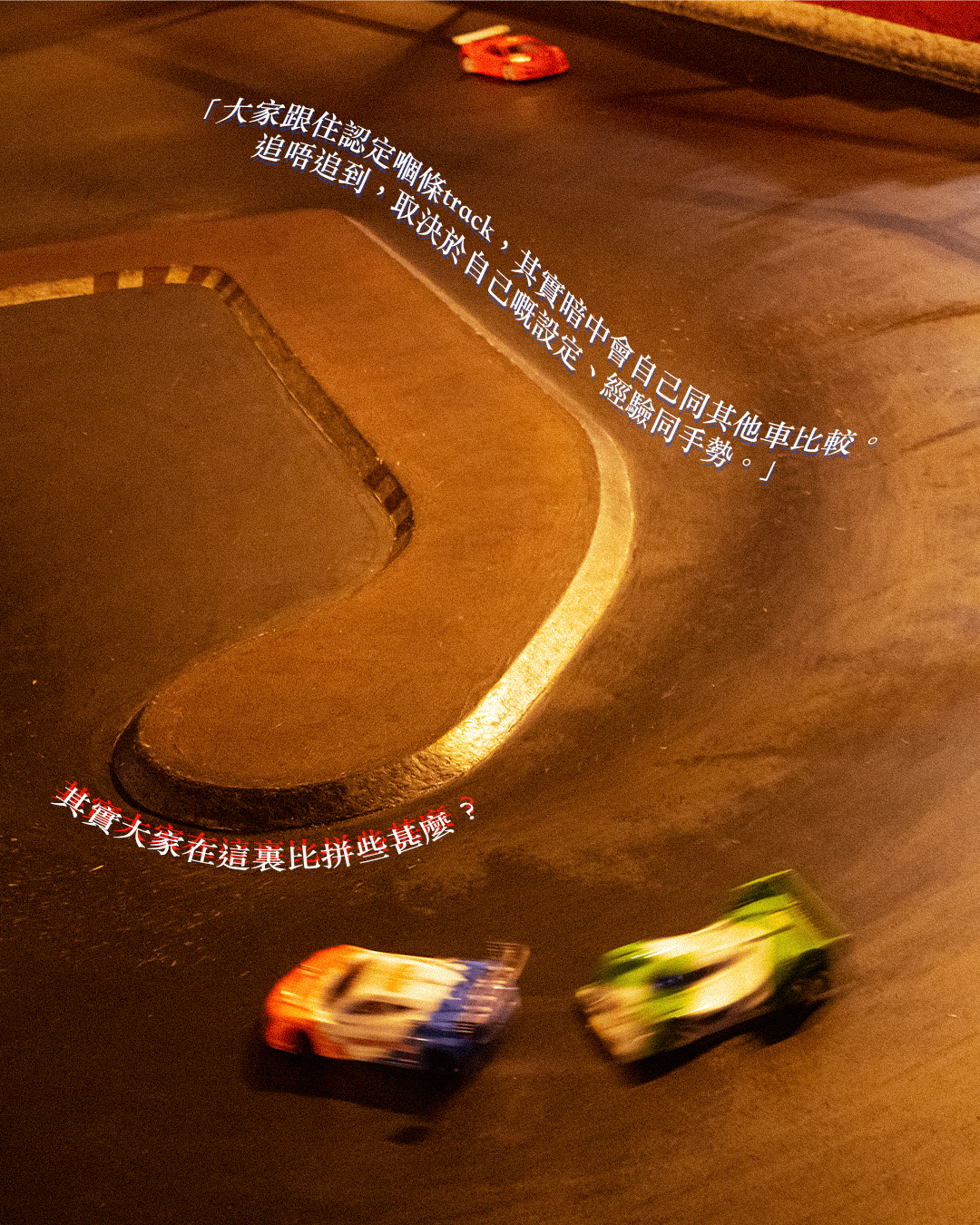 外行人可能不懂,其實大家在這裏比拼些甚麼?「大家跟住認定嗰條track,其實暗中會自己同其他車比較。追唔追到,取決於自己嘅設定、經驗同手勢。」最令他着迷的,是從頭到尾,整件事都是自己設計,自己製作,完成一架徹頭徹尾屬於自己的車。