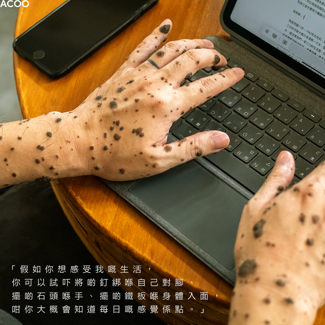 香港人就算不認識他的名字,都會認得這個「點點人」。輕輕觸碰他身上的「黑色點點」,硬得似厚紙皮,又似石頭。「假如你想感受我嘅生活,你可以試吓將啲釘綁喺自己對腳、擺啲石頭喺手、擺啲鐵板喺身體入面,咁你就大概會知道。」