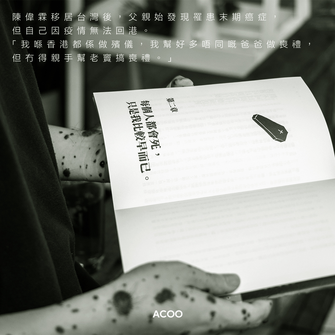 見親人最後一面比較重要,還是繼續自己的Life Mission比較重要?最後,陳偉霖決定留在台灣,繼續自己的使命。父親在香港彌留之際,他在手機螢幕中看着,陪伴着,「我長期喺個電話入面,係呀,我媽拎住我入去,我細佬拎住我入去,咁都係兩個人探,咁叫唔叫面對面?我唔知,我唔係懶有型,我真係唔知呀,你真係見證住佢斷氣,咁係咪叫喺佢身邊?我未figure out到。」