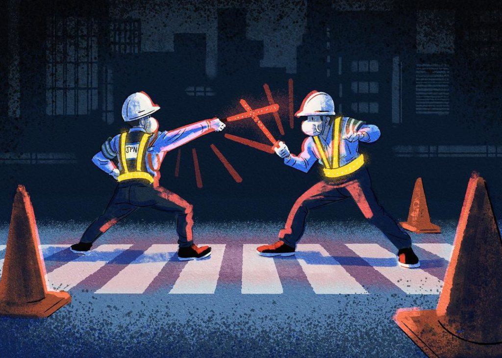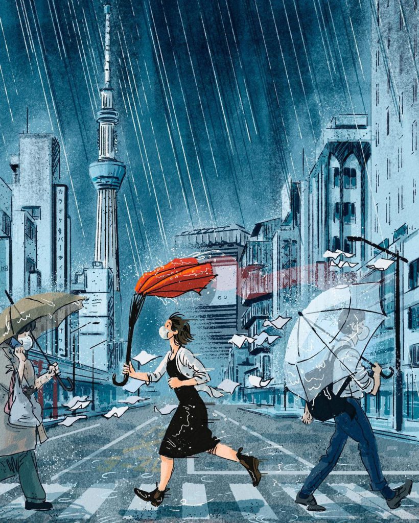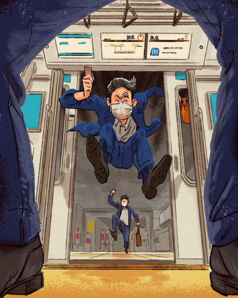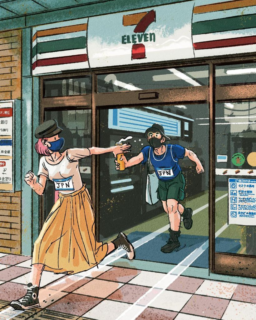 餐廳員工將飲品當排球打?跑手在地鐵閘機前「衝線」?西裝友在車廂玩體操?地盤工人在斑馬線中心玩劍擊?這些都是現居東京的澳洲插畫家Adrian Hogan慶祝東奧創作的一系列東京奧運狂想插畫,主角都是日常在東京見到的人物,有趣的是每位「選手」也戴上了口罩,嚴守疫情規定。