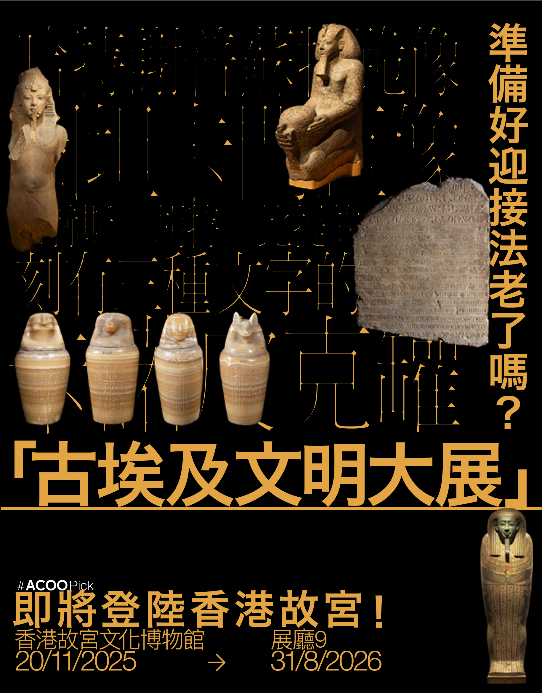 各位歷史迷請注意!香港故宮文化博物館年度重磅大展「古埃及文明大展——埃及博物館珍藏」即將揭幕!這次是香港有史以來規模最大、展期最長的古埃及文物展,多達250件珍貴文物由埃及直送,當中不少更是首次離開埃及展出,絕對是千載難逢的機會,讓你身在香港,也可親眼見證尼羅河畔的輝煌歷史。 展覽將帶你穿越數千年,從法老的國度、圖坦卡門的神秘世界,到薩卡拉的最新考古發現,讓你猶如置身考古現場。 在芸芸展品中,ACOO精選以下幾件,絕對不容錯過: 【女法老哈特謝普蘇特跪像】 誰說權力只屬於男性?這位女法老以男性形象統治埃及逾20年,是古埃及史上最傳奇的女性統治者之一。這座雕像展現了她無上的威嚴與獨特的歷史地位。 【少年法老圖坦卡門巨像】 最廣為人知的法老王,沒有之一!這位充滿傳奇色彩的少年法老,其陵墓在三千年後完好出土,震驚世界。這次展出的巨像氣勢磅礴,讓你近距離感受這位年輕統治者的風采。 【奈赫斯 - 胡特 - 比提的人形棺】 這具來自薩卡拉墓地的彩繪人形棺,是近年重大考古成果之一。此木棺以面上的綠色彩繪而聞名,其綠色象徵死而復活的冥神奧賽里斯。此木棺以面上的綠色彩繪而聞名,其綠色象徵死而復活的冥神奧賽里斯。 【刻有三種文字的石碑】 古代的「國際交流」證據!這塊石碑同時刻有三種不同的文字,見證了古埃及文明在希臘羅馬時期如何與其他文化交流融合。 【卡諾皮克罐】 古埃及人相信內臟也需要被好好保存以獲永生,這些罐子就是用來存放逝者內臟的容器。覺得有點嚴肅?看完實物後,記得去看看博物館推出的古埃及主題盲盒,這些罐子化身成超可愛的毛絨掛飾,讓你把「力量」與「健康」帶回家! 💡購票全攻略💡 門票將於明日,10月22日(星期三)上午10時開售,想去的朋友記得校好鬧鐘! |純粹睇埃及展 🎟️ 成人門票:HK$190 包括此古埃及展(展廳9)及所有專題展覽(展廳1-7) |一口氣參觀所有展覽 🌏 全館通行門票(成人):HK$230 這張是「All-in-one」通行證!除了可以看今次的古埃及展(展廳9),還可以一次過參觀另一個同樣精彩的特別展覽「莫臥兒王朝瑰寶」(展廳8),以及所有常設的專題展覽(展廳1-7)。最適合想用一天時間深度遊覽整個故宮的超級博物館迷! |最抵玩家庭/朋友同行 大小同樂家庭套票(二人同行):HK$240 (原價$285) 大小同樂家庭套票(三人同行):HK$380 (原價$475) 最適合親子或朋友結伴,優惠高達八折! |盲盒發燒友必搶! 「盲盒 + 全館通行彈性成人門票」套票:HK$368 想一次過睇勻故宮所有展覽,又想擁有超可愛的古埃及主題盲盒?這個套票就是你的最佳選擇!包含一張全館通行門票(可參觀展廳1-9)及一個隨機款式的毛絨掛飾盲盒,絕對是收藏家必入手的組合! |鐵粉級會員專享 想快人一步?於11月2日或之前成為「香港故宮之友」,即有機會參加11月19日的會員專屬預覽,並獲贈非賣品特別版掛飾! 古埃及文明大展——埃及博物館珍藏 日期: 2025年11月20日 至 2026年8月31日 地點: 香港故宮文化博物館 展廳9 門票開售: 2025年10月22日 上午10時 ——————— In ACOO, you can discover a dynamic lifestyle in #ACOOPick.