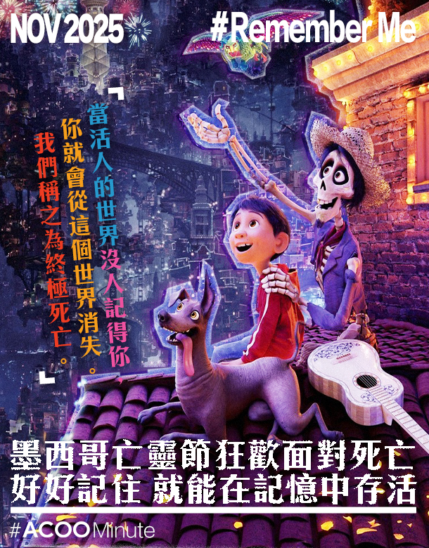 Pixar電影《玩轉極樂園》(《Coco》)以墨西哥傳統節日亡靈節為背景,令更多人認識這個特別的節日。今天是亡靈節,這個狂歡悼念亡者的日子,向我們展示了另一種死亡觀:原來告別,也可以不必傷春悲秋。 墨西哥人相信在亡靈節這天,亡靈會回到人間,與家人朋友相聚。人們會裝飾墓地,在故去的親友墳前燃點蠟燭,舖上萬壽菊,擺放他們生前喜愛的食物,將墓園變成唱歌、飲酒的派對。街頭亦有亡靈節遊行,大家會穿上傳統服飾,把臉塗成骷髏的模樣,周圍佈置著色彩斑斕的剪紙裝飾,街上都是唱歌跳舞的人,充滿嘉年華氣氛,以狂歡的姿態悼念逝去的人。 死亡代表著終結與失去,人類無法控制,所以對於死亡,我們大多是抱持恐懼逃避的態度。但墨西哥人的死亡觀卻截然不同。墨西哥諾貝爾文學獎得主Octavio Paz曾這樣形容他們的生死觀:「墨西哥人把死亡掛在嘴邊,他們調侃死亡、親吻死亡、慶祝死亡、與死亡同寢。」能夠以戲謔的態度面對死亡,因為他們相信死亡並不是生命的終點,而是生命循環的一部分。 在電影《玩轉極樂園》中,亡靈會存在於另一個世界,只有人間還有人記得他們,他們就不會消失;但一旦被遺忘,便會迎來所謂的「終極死亡」。記憶和愛,就是連結生者與亡者的橋樑。人與人之間有過的羈絆,確切地影響了我們的生命,形塑了如今的我們。在我們身上,就有他們存活的痕跡。 人生就是不斷的告別,不論是人還是事物的消逝,我們總是很難淡然接受,所以才有愛別離之苦。我們可能要花上一生的時間學習告別,或許可以參考墨西哥人面對生死的姿態:悼念不一定要傷春悲秋,也可以熱鬧歡騰;面對離別,不一定只有淚水,也可以帶著笑容。只要好好記住,逝去的人事物,都會在我們的記憶中存活。 文字:林三 @lam.three 設計:PO @p12_o28 -------------------- In ACOO, you can get refreshed in #ACOOMinute.