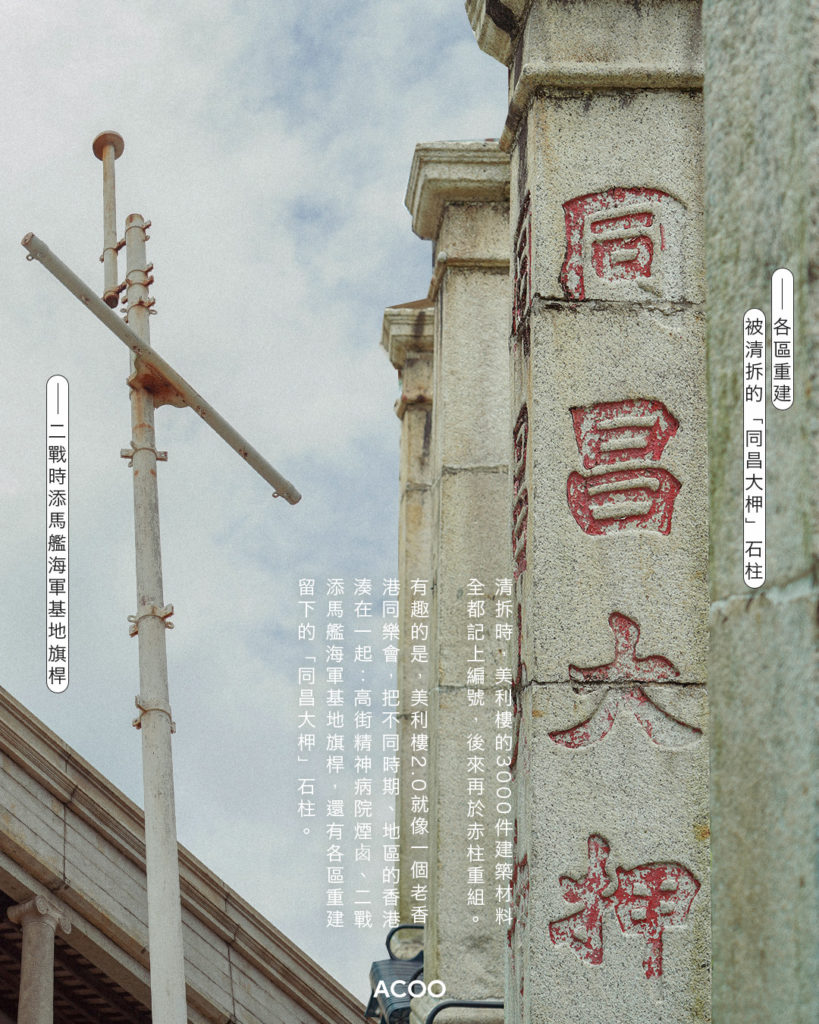 經歷紛紛擾擾,美利樓最終仍避不過被拆卸的命運。幸運一點的是,分拆保留了3000件建築材料,全都記上編號,後來再於赤柱重組。不過有趣的是,美利樓2.0就像一個老香港同樂會,把不同時期、地區的香港湊在一起:因為重建時煙卥遺失,所以現時的是取用高街精神病院的煙卥,聽起來這個組合好像為恐怖程度錦上添花。之外,美利樓外近卜公碼頭的旗桿,則來自二戰時添馬艦海軍基地。最後,還有幾枝「同昌大柙」石柱,均來自各區重建時被清拆留下的組件。