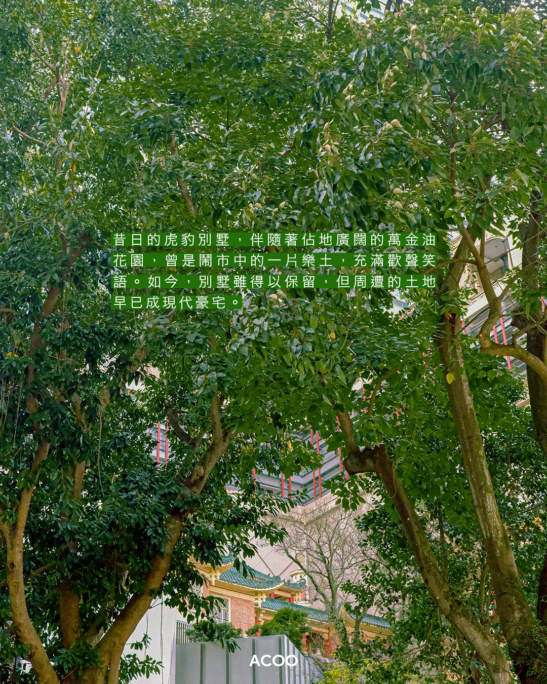 昔日的虎豹別墅,伴隨著佔地廣闊的萬金油花園,曾是鬧市中的一片樂土,充滿歡聲笑語。如今,別墅雖得以保留,但周遭的土地早已成現代豪宅。此刻,我們就只能看着被鋼筋水泥叢林緊緊環抱的虎豹別墅,和被保留的幾個雕塑,幻想那段舊日的時光。