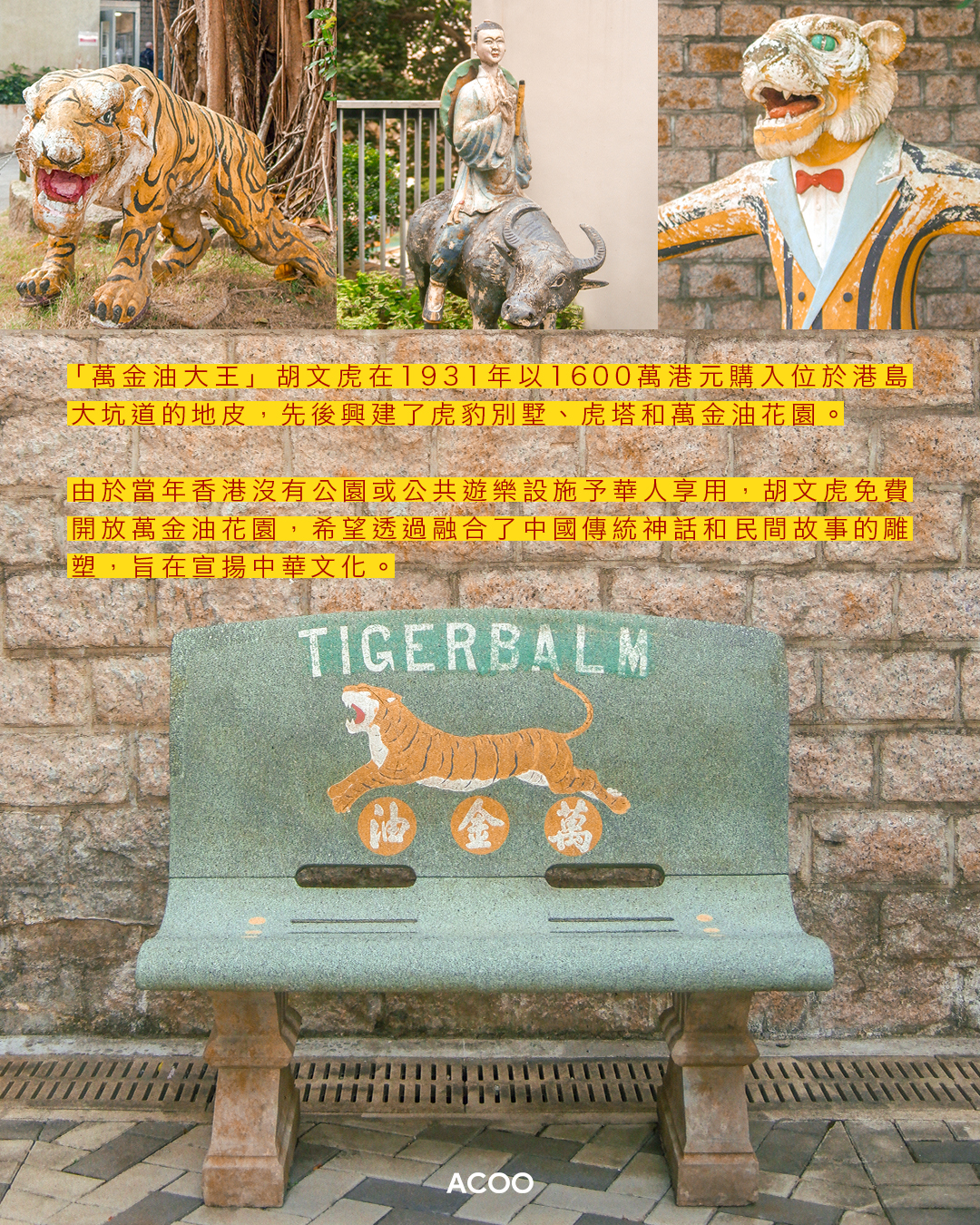 胡文虎於1931年以1600萬港元購入位於港島大坑道的地皮,先後興建了虎豹別墅、虎塔和萬金油花園。由於當年香港沒有公園或公共遊樂設施予華人享用,胡文虎免費開放萬金油花園,希望透過融合了中國傳統神話和民間故事的雕塑,旨在宣揚中華文化。