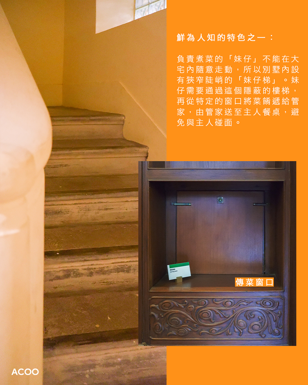 除了精美的建築和裝飾,虎豹別墅還隱藏著一些鮮為人知的設計,反映了當時的社會階級觀念和富豪的生活方式。例如由於負責煮菜的「妹仔」不能在大宅內隨意走動,別墅內設有狹窄陡峭的「妹仔梯」。妹仔需要通過這個隱蔽的樓梯,再從特定的窗口將菜餚遞給管家,由管家送至主人餐桌,避免與主人碰面。
