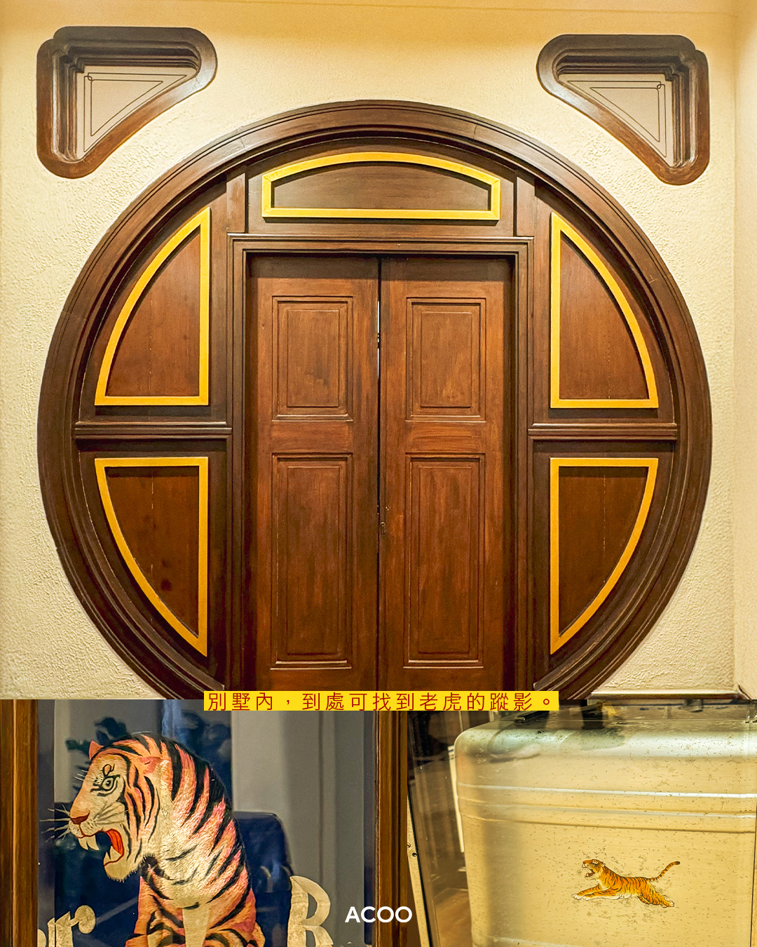 虎豹別墅屬中式文藝復興建築風格,揉合中西建築方法及建築理論。踏入別墅,便可看到以月洞門為設計,配以30年代製成,目前仍精細非常的彩繪玻璃的正門。地下一層設有客廳、飯廳、起居室、遊戲室及音樂室。站在大廳中間,可看到通往起居室的樓梯上方裝飾以中式傳統的飛簷斗拱,紅綠金的配色,與西式建築元素形成強烈對比;而飛簷下則有姜太公釣魚及八仙過海的壁畫,更見胡文虎當年的精心設計。