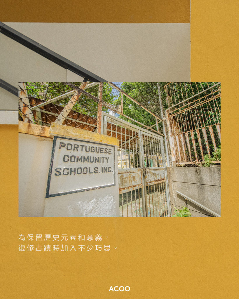1954年,賈梅士學校的成立為葡僑兒童和多個種族的兒童提供幼稚園至小學教育,而校名也是以葡萄牙詩人賈梅士名命,所以校舍採用葡萄牙的象徵顏色——既明亮,飽和度又高的黃色。不過使用多年後,飽受風霜洗禮才慢慢褪變至淡黃色。