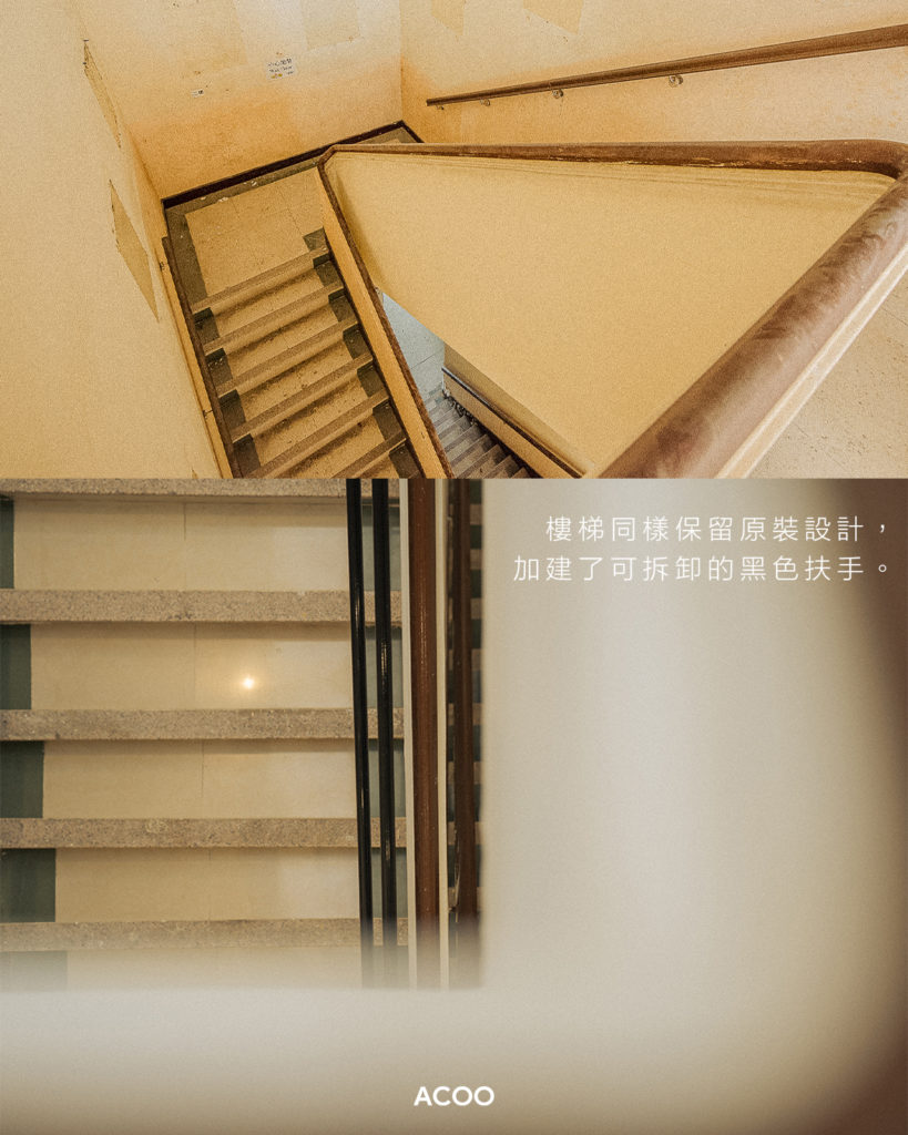 根據定義特徵元素(character defining element),保育和活化非常重視建築的歷史意義元素,而校舍的樓梯便是其一。為了盡量把值得保留的元素不受破壞、原汁原味的留下,又要切合現今規例,葉頌文博士選擇加建可拆卸的黑色扶手,「將來條例可能修整嘅時候,呢啲加建都可以拎走。」