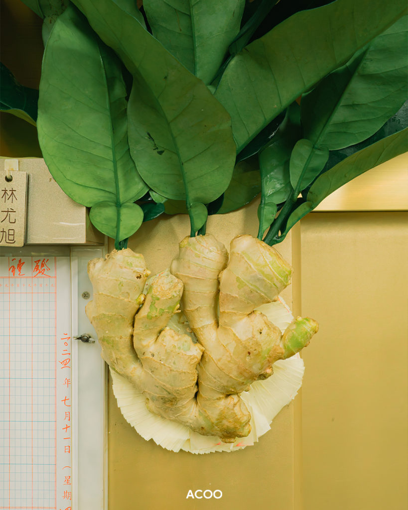 其次,還有一舊供奉給土地公的生薑,並插上了一把刀,寓意「夠薑」(有膽識)。另外,在二樓的櫃檯旁也有代表安排特別位置,掛上代表相同寓意的生薑,視乎前一天的生意來決定要否換薑。