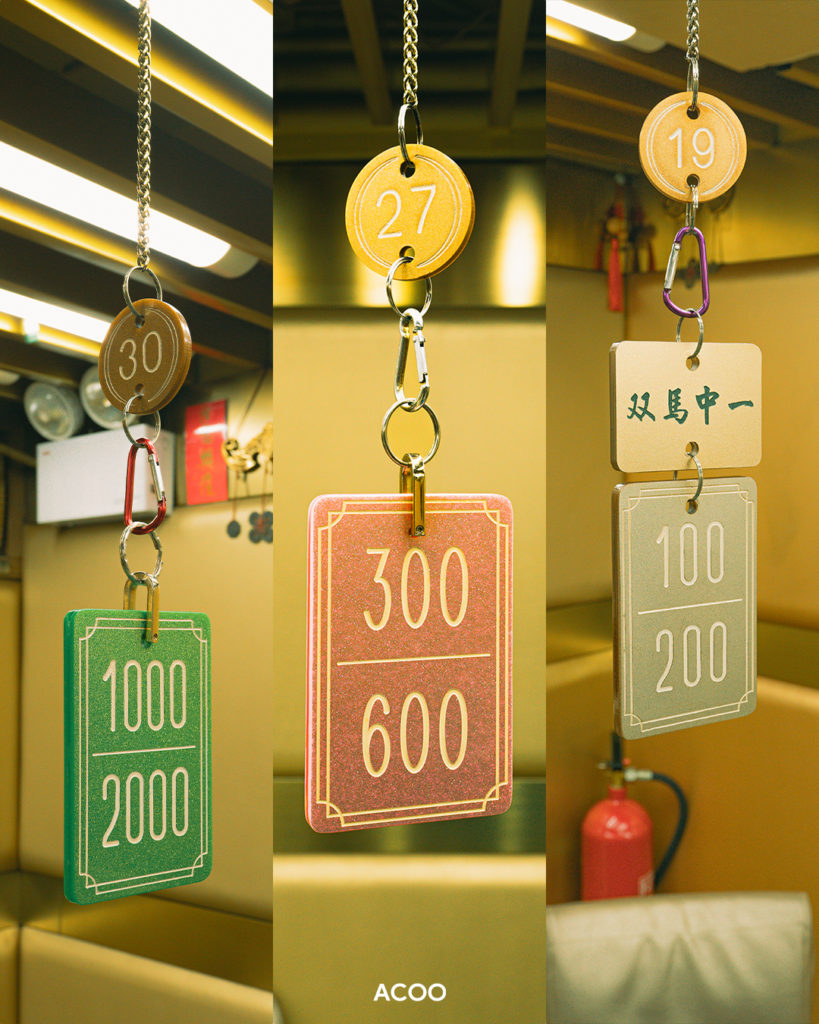 麻雀館內有不同分區,以檯上空中吊掛的小牌子作區分,例如「100/200」、「200/400」、「500/1000」及「1000/2000」等,代表的的是不同金額。麻雀檯旁邊還有一個小架子,讓客人可以擺放飲品和食物,現在外賣平台發達,能立即為客人點上不同餐點,但從前雀館職員可要親自開伙煮餐,禮哥說:「煲湯、炒粉麵,你叫咩食煮到都煮畀你,煮唔到就出去買畀你,全部都係免費。」