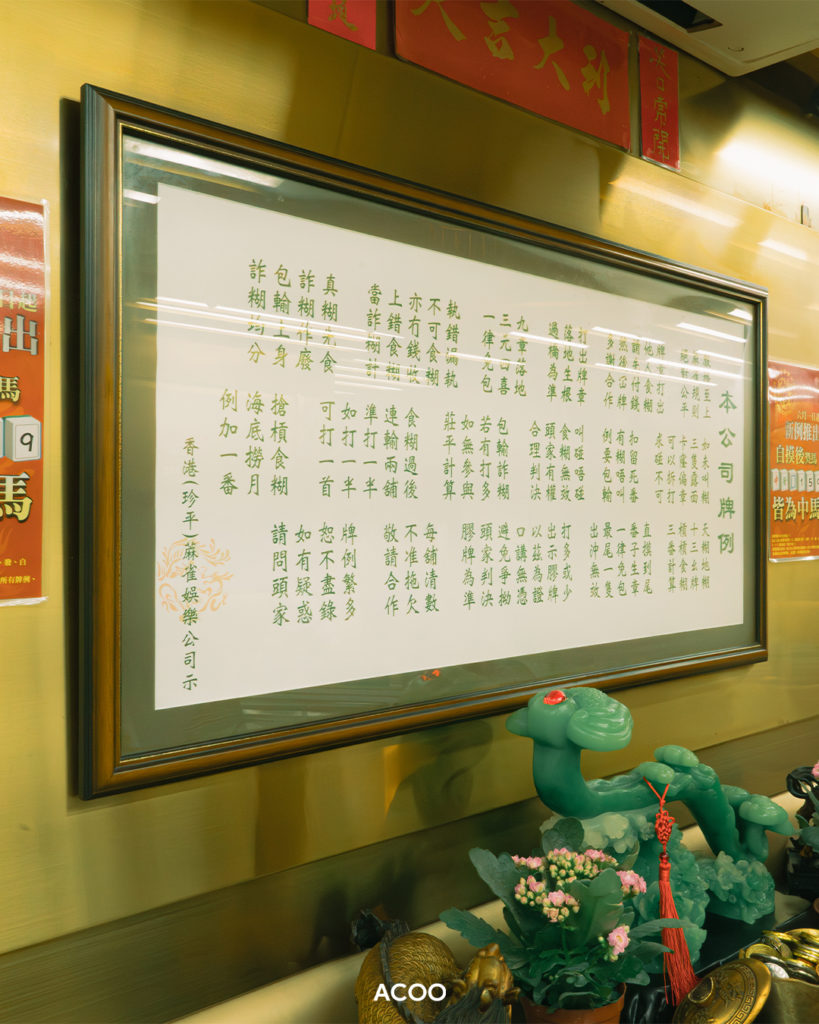 除此之外,實際每天來麻雀館開檯打牌的人客亦非黑道,員工笑言都是熟口熟面的街坊,入行5年的櫃面員工阿康說:「街坊街里都好得意,坐埋一齊會講下湊仔經,又會講下買餸、你個仔點,好多生活上嘅事都會分享。」想像中充滿殺氣的畫面,瞬間溫馨起來。