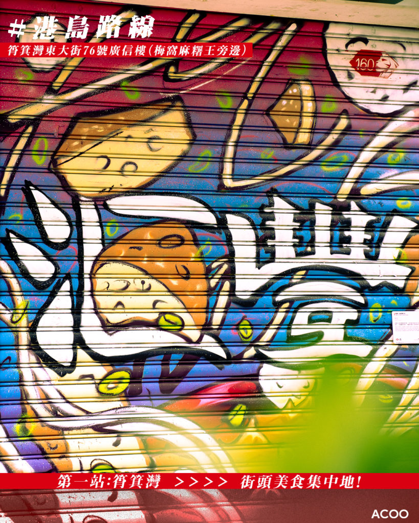 這條路線建議在下午開始,順著日落的節奏探索香港島的藝術印記。首站可到訪筲箕灣,觀賞以手繪漫畫風格呈現的地道美食壁畫。藝術家將熱騰騰的魚蛋粉繪進畫中,喚起街坊們共同的味覺回憶。肚子餓了,也可來一碗魚蛋粉、一底格仔餅,讓味覺帶領回憶遊走!