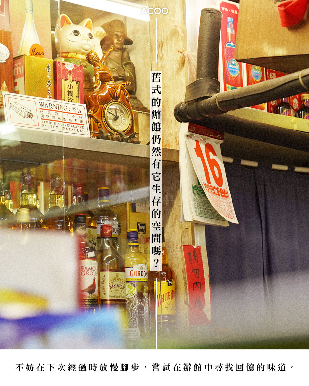 有沒有發現,走入舊式屋村,在不起眼的角落,總會有一間辦館 —— 燈光昏暗、不少冷氣也沒有,只靠着一把大風扇在轉動;而貨物就擺放得亂中有序,在貨架上排,放滿感覺塵封多年的威士忌、拔蘭地、三蒸、五加皮、茅台等唐酒洋酒?你有嘗試過走進去嗎?而你又有疑惑過是甚麼讓人們願意走進去嗎?