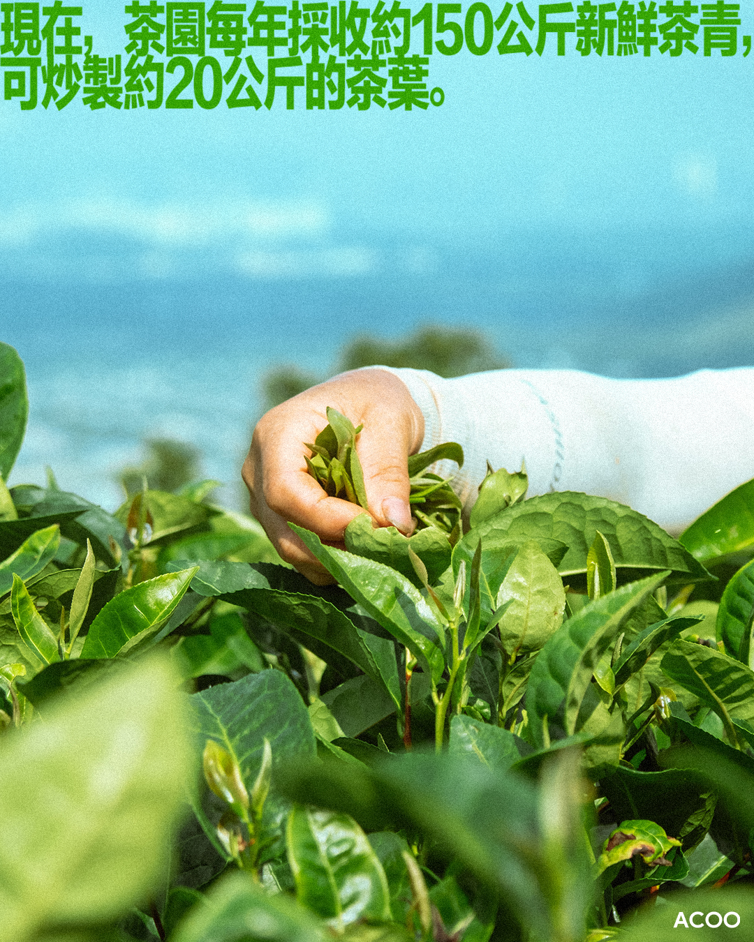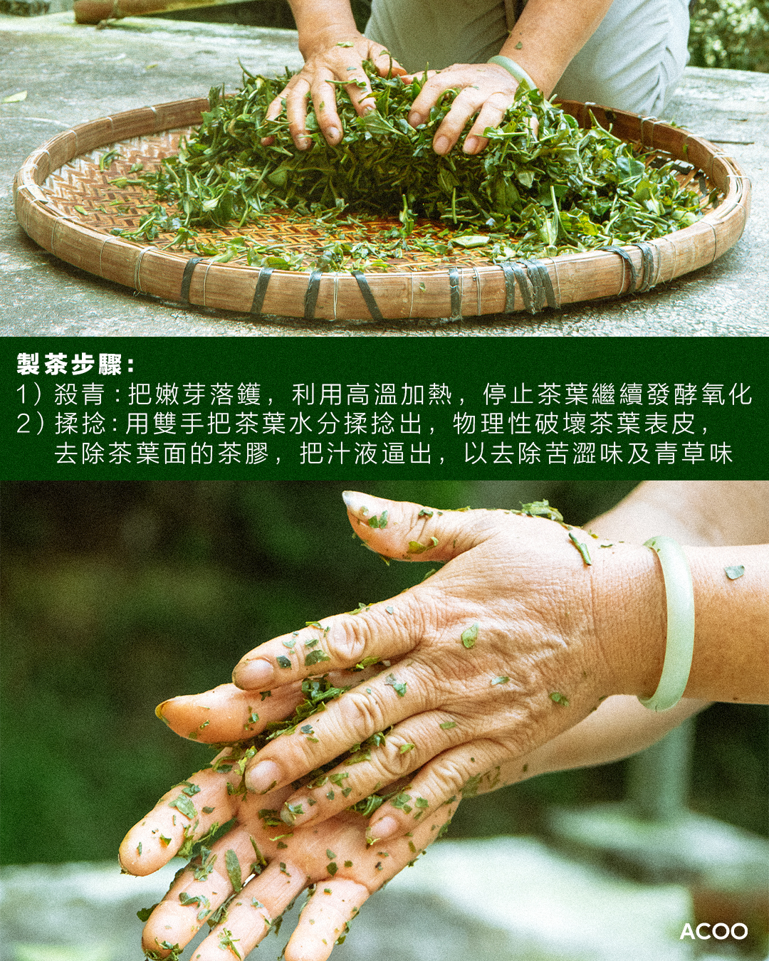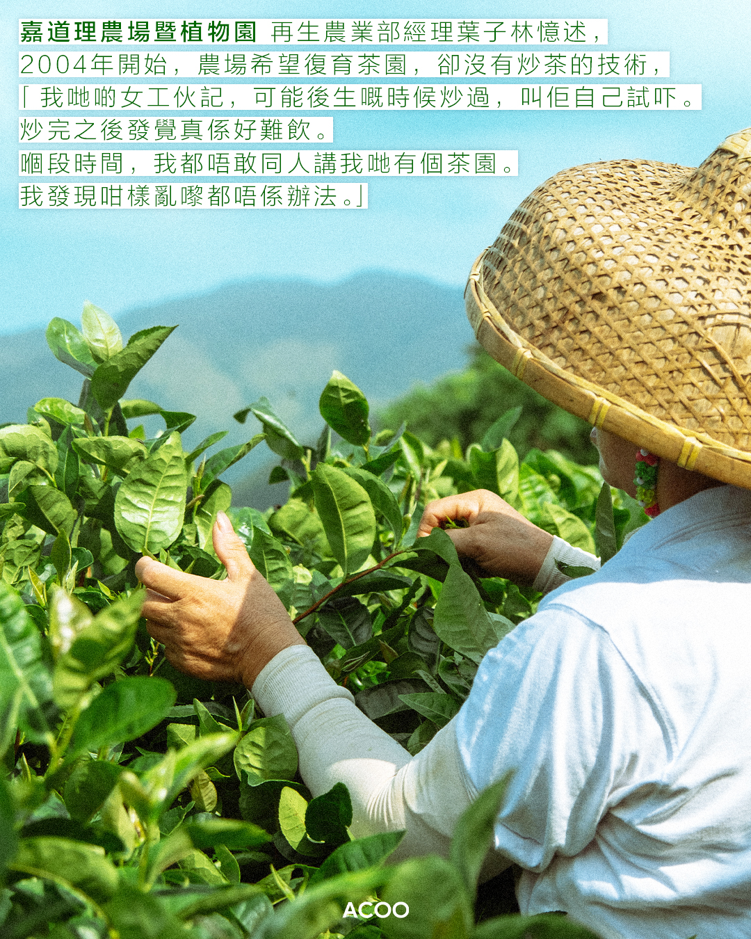 在採茶青的日子,再生農業部果園管工楊鳳珍(珍姐)清晨便會開工,收採茶樹的嫩芽部分。而採收茶葉只是製茶的第一步。珍姐及後便會把嫩芽落鑊,利用高溫加熱,停止茶葉繼續發酵氧化,再用雙手把茶葉水分揉捻出,物理性破壞茶葉表皮,去除茶葉面的茶膠,把汁液逼出,以去除苦澀味及青草味。