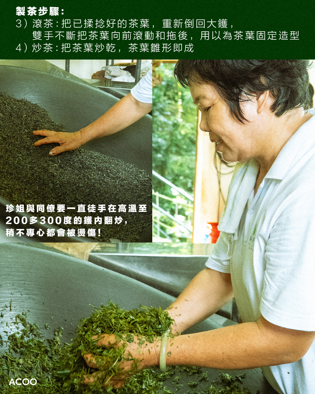 然後,珍姐便會把已揉捻好的茶葉,重新倒回大鑊,雙手不斷把茶葉向前滾動和拖後,用以為茶葉固定造型。這個步驟稱為「滾茶」。最後,把茶葉炒乾,茶葉雛形即成。由於要把茶葉一直翻炒,拖後,珍姐與同僚雙手要一直在高溫至200多300度的鑊內,稍微不專心都會被燙傷!現在,茶園每年採收約150公斤新鮮茶青,可炒製約20公斤的茶葉。