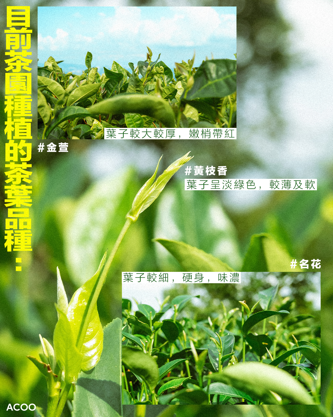 整個出產茶葉的種植過程橫跨一年。從冬至時,工人們會開始修建茶樹,刺激春茶芽生長,到立春追加肥料,到了清明節前後,茶樹的新梢陸續長出,4月至9月便可開始採茶青。嘉道理的茶園目前主要栽種茶樹有3款,包括名花、黃枝香,以及較多香港人聽過的的金萱。