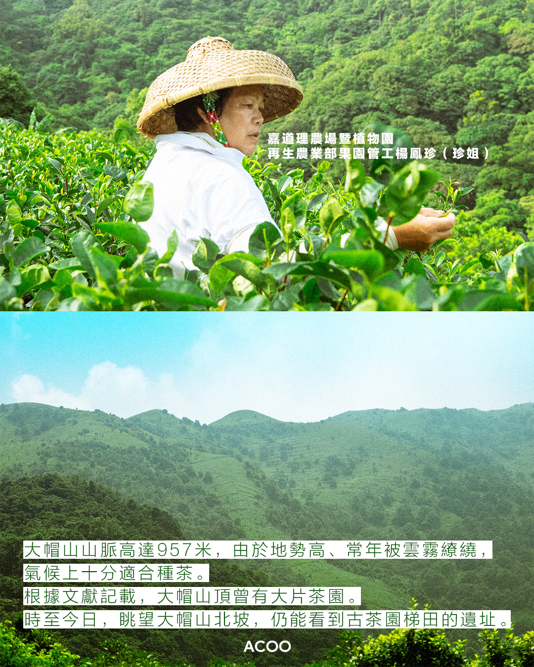 其實,香港種茶、製茶歷史悠久。根據康熙二十七年(1688年)《新安縣志》記載:「大帽山,在五都,形如大帽,上有石塔,山中出茶。」由於大帽山山脈高達957米,地勢高、常年被雲霧繚繞,氣候上十分適合種茶。根據文獻記載,大帽山頂曾有大片茶園。時至今日,眺望大帽山北坡,仍能看到古茶園梯田的遺址。在2004年時,嘉道理農場暨植物園再生農業部開始在梯田種植茶樹,後逐步發展成為今時今日的共有2000棵茶樹的茶園。