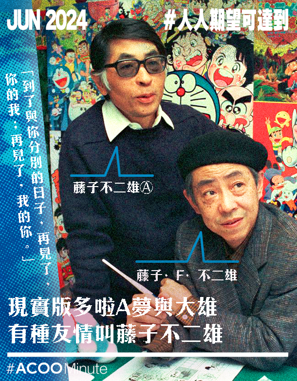 《100%多啦A夢 & FRIENDS》巡迴特展將登陸香港,讓人想起小時候看《多啦A夢》,都會羨慕大雄,無論他闖了多少禍,多啦A夢都只是搖搖頭說句「真是拿你沒辦法」,但永遠都在他身邊。現實中,兩位藤子不二雄的友情,同樣為人稱羨。 或許有人不知道,藤子不二雄其實是兩個人:畫《多啦A夢》的是藤子・F・不二雄,本名藤本弘;另一位是藤子不二雄A,個人著作有《忍者小靈精》、《怪物小王子》等,本名安孫子素雄。 藤本弘小時候就像大雄一樣,成績不佳,膽小內向,唯獨喜愛畫畫,在漫畫世界裡自得其樂。10歲的時候,一個人闖進了藤本弘孤獨的世界,那就是轉校生安孫子素雄。二人同樣喜歡畫畫,一拍即合,迅速成為好友。他們一起追星,搶購偶像「漫畫之神」手塚治虫的漫畫,又一起寫信給偶像。愛畫漫畫的他們,起了個共同筆名,投稿到雜誌,賺到的稿費有時拿來買畫具,有時拿來一起看電影。 但漫畫家始終不是穩定職業,畢業後二人都曾經有過正職,後來還是決定要熱血地追一次夢,毅然辭職,跑到東京畫漫畫。他們住在新手漫畫家聖地「常盤莊」,為了賺取稿費,瘋狂接稿,沒日沒夜的畫。後來因為稿量實在太多,接應不暇而脫稿,結果被出版社列入黑名單,捱了一段拮据的日子。 最佳拍檔,可以共患難,也能共富貴。二人的漫畫事業漸上軌道,憑《Q太郎》等作品闖出名堂,後來開始朝不同路線發展,專注個人作品,安孫子素雄轉畫成人黑色幽默漫畫,而藤本弘則持績創作兒童漫畫。兩人既有合作,亦是競爭關係,但他們仍然像往常一樣,為對方作品提供意見,互相支持。 直至藤本弘身體出現問題,因擔心往後兩家人因版權問題有糾紛,決定解散藤子不二雄。但即使解散,二人仍保留「藤子不二雄」的筆名,只加了英文字母作分別。1996年,藤本弘先走一步。安孫子素雄以漫畫《别了,朋友》告別這個相識半世紀的拍擋兼摯友。漫畫裡寫道:「我與你相會,與你交談,與你奔跑,與你哭泣,與你歡笑⋯⋯到了與你分別的日子,再見了,你的我;再見了,我的你。」前年4月,安孫子素雄亦追隨了藤本弘的腳步,二人於天國重聚。 兩個摯友,相伴半世紀。一個筆名,承載了一段真摯的友誼。安孫子素雄曾形容,與藤本弘是超越家人朋友的特殊關係。人生得一知己,能夠與你一同奮鬥,在追夢路上並肩同行,夫復何求? 文字:林三 @lam.three 設計:Kayan @yipyn ——————— In ACOO, you can get refreshed in #ACOOMinute. #藤子不二雄 #多啦A夢 #忍者小靈精