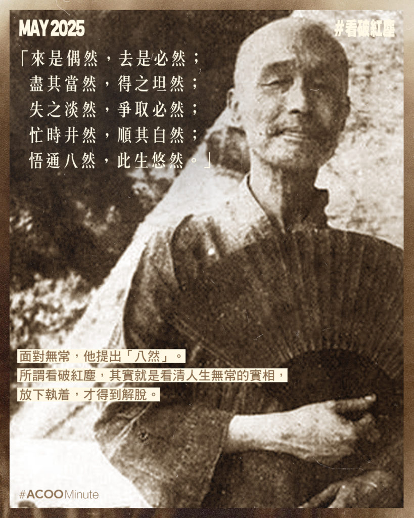 人生的苦痛源於無常。前半生有藝術助他排解愁緒,最後發現在佛法裏才找到解脫。面對無常,他提出「八然」:「來是偶然,去是必然;盡其當然,得之坦然;失之淡然,爭取必然;忙時井然,順其自然;悟通八然,此生悠然。」所謂看破紅塵,其實就是看清人生無常的實相,放下執着,才得到解脫。