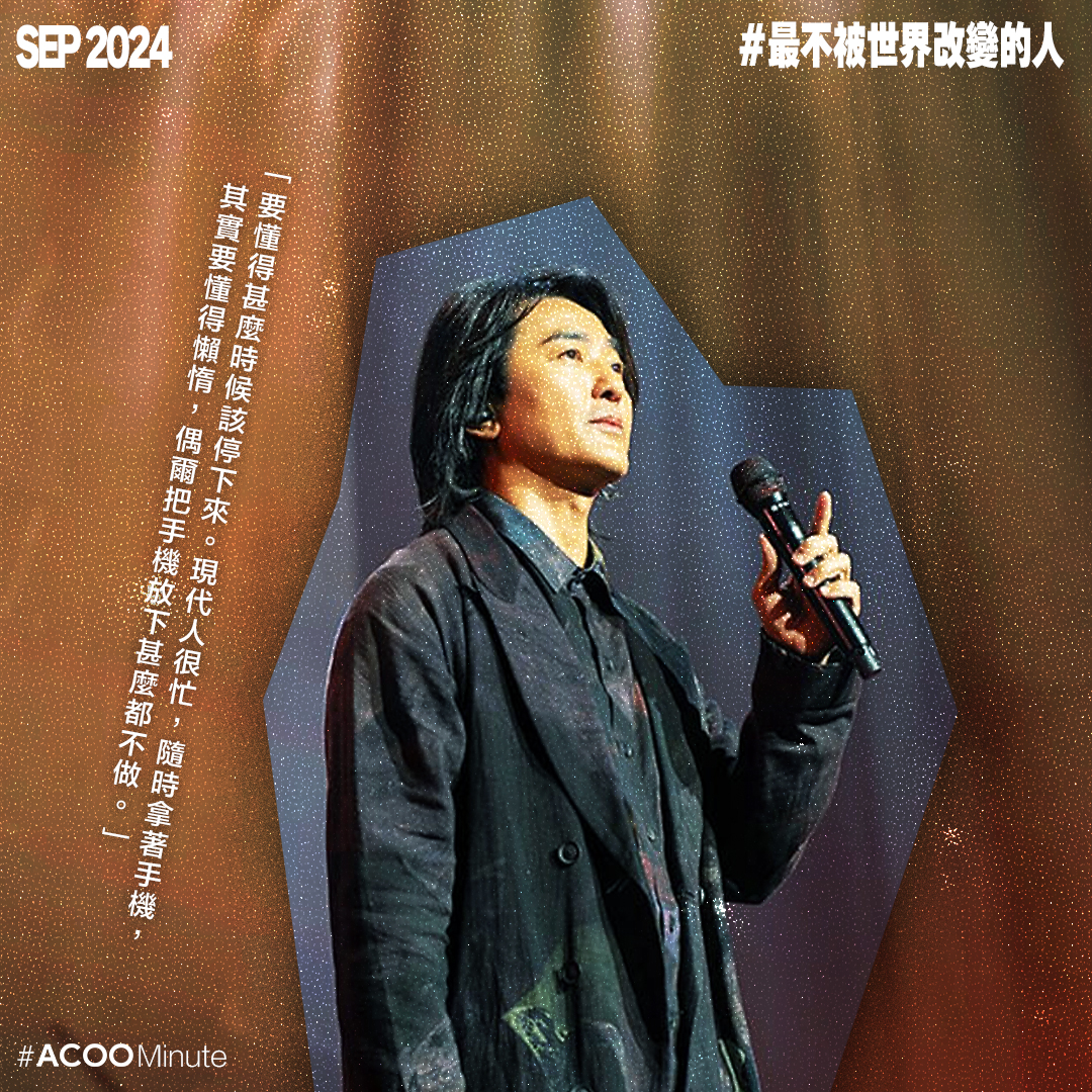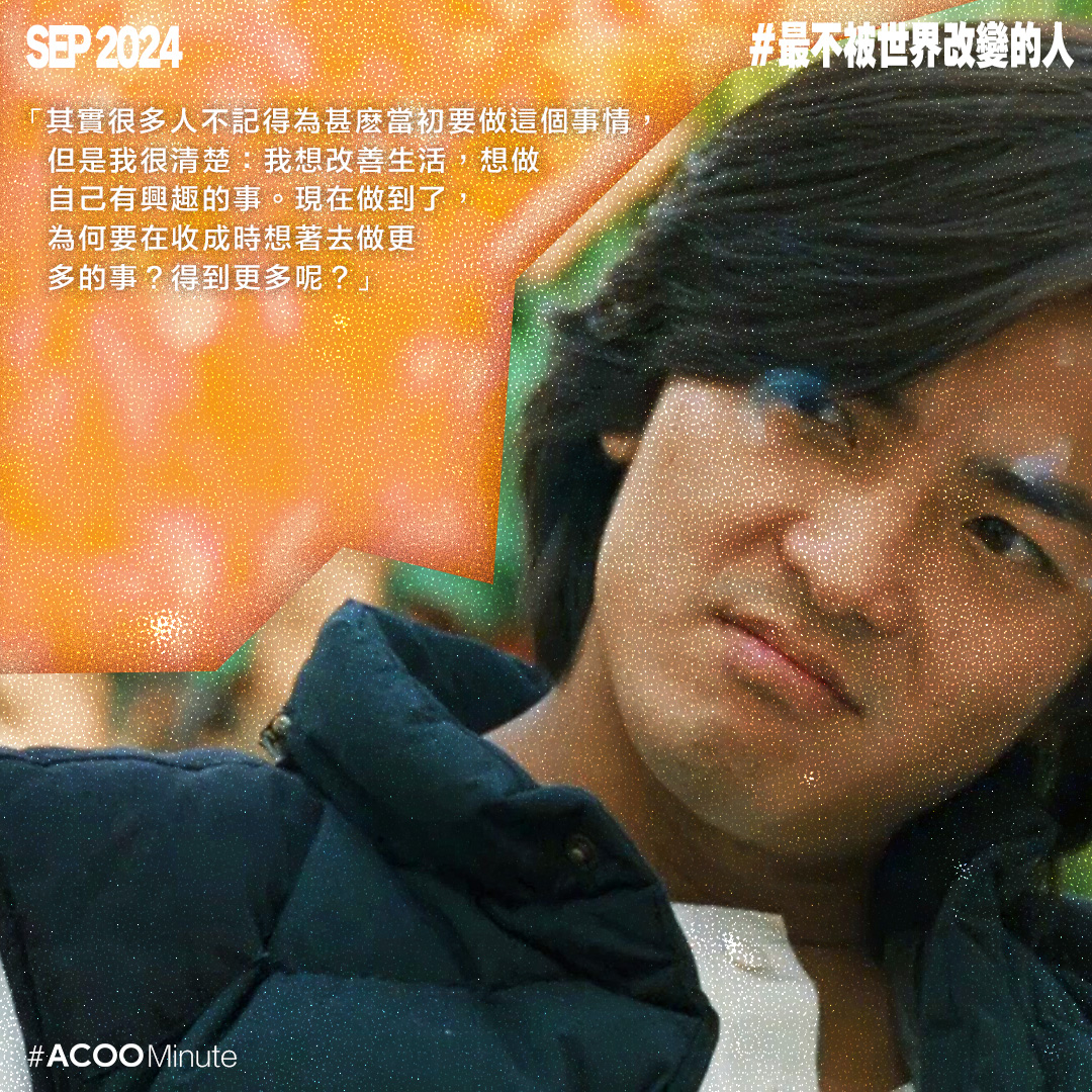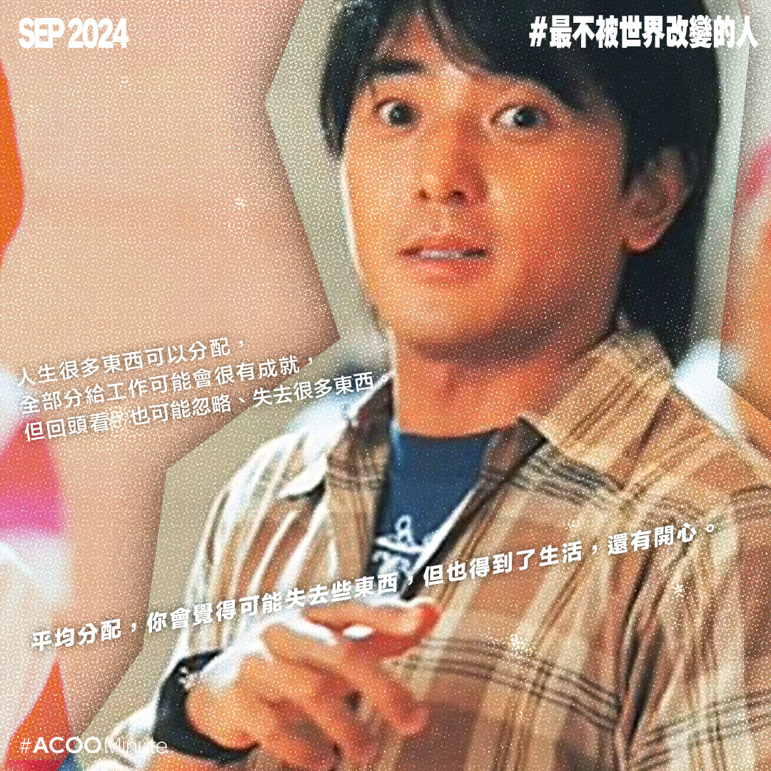「一個人最快樂的就是能夠選擇自己想要做的事。過去20年,我不是賺了很多,不過已經足夠,所以我今日可以選擇自己想做的事。」他失去了更多的名利,卻賺到了別的,「人生很多東西可以分配,全部分給工作可能會很有成就,但回頭看,也可能忽略、失去很多東西。平均分配,你會覺得可能失去些東西,但也得到了生活,還有開心。」其實他看的透徹,也清楚知道自己要的是甚麼,選擇了最適合自己的生活。