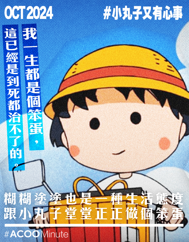 大家的童年回憶中,小丸子一定佔一席位。傻更更的小丸子,懶惰貪玩,成績差,愛發白日夢,有時有點厭世。早上賴床喊著不想上學的模樣,誰沒有共鳴?她又常常以歪理為自己的散漫辯護,乍聽讓人哭笑不得,細想又似乎有點道理。 |有些事情不是我不在意,而是我在意了又能怎樣 執著是人類很多煩惱的起源。愈在意一件事,愈容易會被其控制你的情緒。偏偏很多時,事情的結果並非你可以控制,即使你已經拼盡全力,仍有可能會失敗。即使你有多在意,也無法改變結果。既然如此,那就不如改變心態:如果在意也沒用的話,試試不用太執著,佛系一點,隨遇而安吧。 |作為一個笨蛋堂堂正正地活下去 「我一生都是個笨蛋,這已經是到死都治不了的。那麼我也只有堂堂正正地,作為一個笨蛋活下去了。」聽起來就像是小丸子為自己的懶散找藉口。但仔細想想,學習接受自己,是很多人一生的課題。努力改善自己的缺點,固然是好事,但若然太著眼於自己的不足,每天在厭惡自己,動力只會變成壓力。接受自己的不完美,才能掙脫束縛。作為一個你,堂堂正正地活下去吧。 |只要好好活著就一定會有好事發生 生活充斥著各種不如意,但有沒有好事發生,其實也在乎你怎樣看。其中一集小丸子的內容,講述她們家漏雨,要趕忙張羅鍋碗瓢盆裝雨水,但小丸子卻發現,雨水打落的聲音,聽起來就像演奏音樂,頓時心情變得暢快。一念之間,馬上將麻煩事變成樂事。只要擁有樂觀的心,一直走下去,總有機會遇上好事。 文字:林三 @lam.three 設計:Owen @wai.ho.98 ——————— In ACOO, you can get refreshed in #ACOOMinute.