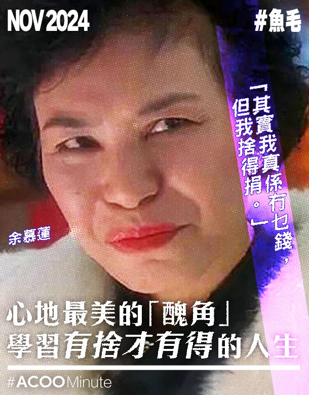 提起余慕蓮,可能會首先聯想起她演的清潔工、醜婦角色,然後是關於她慷慨捐輸的美談,例如她早前宣佈會將部分遺產捐予工業傷亡權益會,引起不少迴響。做善事的人很多,但對於余慕蓮,大家更為敬佩,原因也許與她的形象有關。 余慕蓮投身演藝界多年,雖很少當主角,但名字卻是家傳戶曉,你也一定看過她的戲。戲中她大多演低下階層,現實中的余慕蓮,亦算不上大富大貴。17歲才小學畢業的她,做過戲院帶位、售貨員,入行演員初期收入不算多,她很珍惜工作機會,有job就接,試過36小時不睡覺開工,亦住過五伙人共住的劏房。窮過,自然學會節儉,即使半夜收工,她也捨不得搭的士,情願等巴士回家。 對自己節儉,卻捨得對別人慷慨。她在2005年曾從20多萬的長期服務金中捐出8萬,在貴州山區興建一所學校;試過出自傳,將收益捐予兒童癌病基金;早前亦宣佈會將現時自住的物業,於身後捐予東華三院。即使不是擁有太多,也願意付出,正是大家敬重她的原因。 「我做戲做慣垃圾婆呢啲小人物, 人哋以為我好窮冇錢,其實我真係冇錢,但我捨得捐。」余慕蓮年幼父母離異,母親冷待她,又不時叫她問人借錢,童年過得不快樂。也許正因清楚愁苦的滋味,對於身處困苦中的人特別有同感,更願意分享。很多人說錢財身外物,但對不少人來說,錢是安全感來源,無人嫌多。能夠知足,也不是人人做到。 余慕蓮退休後繼續住在一個早年購入的400多尺單位,閒時去看戲,跟朋友飲茶去旅行,去老人院做義工。她說家中有塊牌寫著「知足常樂」,常說覺得上天待她不薄,最重要是不要與人比較,「我見一日就做一日人,我唔會羡慕人亦唔會妒忌人,我好滿足了。」 錢並非最重要,名利也不是。余慕蓮演的角色很多時都是丑角,扮醜她也不介意,自覺找到自己定位。她可能不是一線演員,但能夠在觀眾心中留下身影,她覺得已足夠了。 余慕蓮今年已87歲,近年身體有些毛病,曾一度入住ICU,出院後覺得,現在的日子都已是賺了,隨時離去也不怕,「瞓醒一日就當賺多一日。開開心心,行得食得瞓得就得了。」智慧老人,到了這年紀,看淡生死,淡薄名利,參透了人生最重要的並不是錢,最緊要健康開心。 捨得捨得,懂得捨去,就能得到更多、更重要的東西。捨去財產,得到助人的快樂,更是無價。一生是否能名成利就,享榮華富貴,只是外人評論你的標準。於自己而言,能知足常樂,一生無悔,也許已是最富有。 文字:林三 @lam.three 設計:Kayan @yipyn -------------------- In ACOO, you can get refreshed in #ACOOMinute.