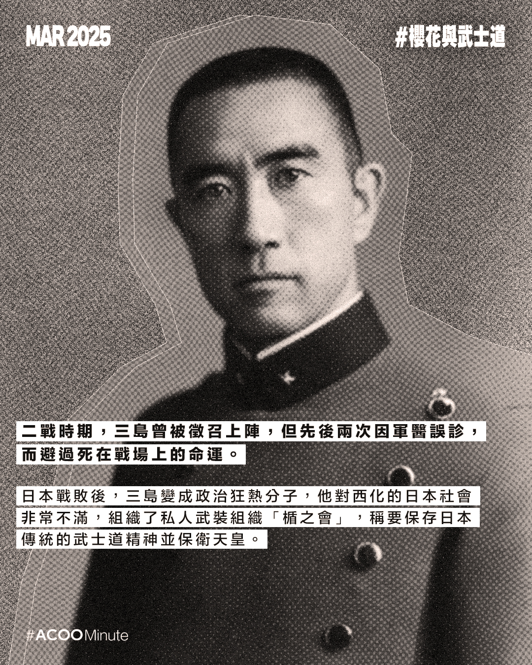 二戰時期,三島曾被徵召上陣,但先後兩次因軍醫誤診,而避過死在戰場上的命運。日本戰敗後,三島變成政治狂熱分子,他對西化的日本社會非常不滿,組織了私人武裝組織「楯之會」,稱要保存日本傳統的武士道精神並保衛天皇。立場激進的他,曾受政治立場對立的東大全共鬥邀請,在東大參加辯論會,以一敵千,雙方激辯之下,沒有如外界預期般起衝突,反而像場學術討論。辯論會情況被記者拍下,數年前影片經數位修復後上映。