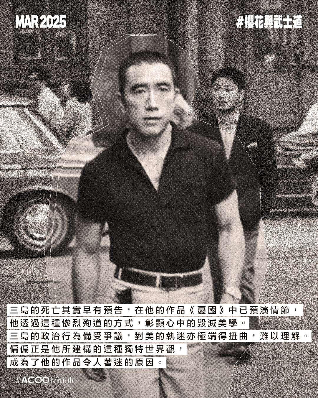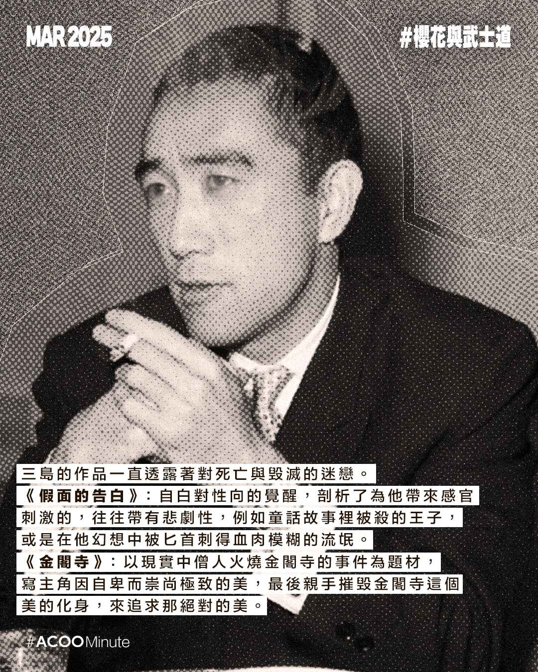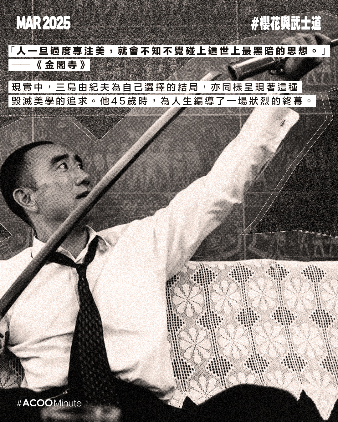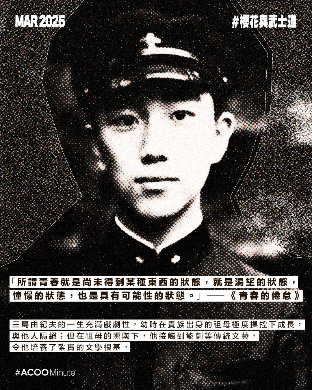 日本戰後文學大師三島由紀夫的一生充滿戲劇性。他在文學界享負盛名,曾三度獲諾貝爾文學獎提名,著有《假面的告白》、《潮騷》、《金閣寺》等經典作品。極度執迷於武士道精神的他,後期投入充滿爭議性的政治活動,最終選擇切腹作為自己的結局,為他戲劇性的一生壯烈落幕。