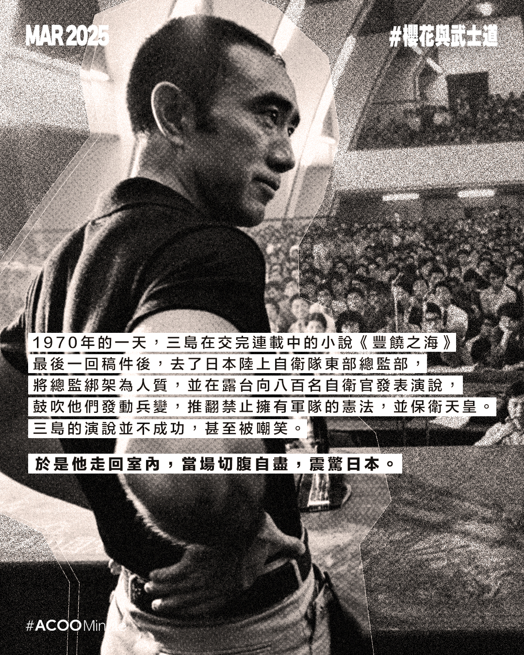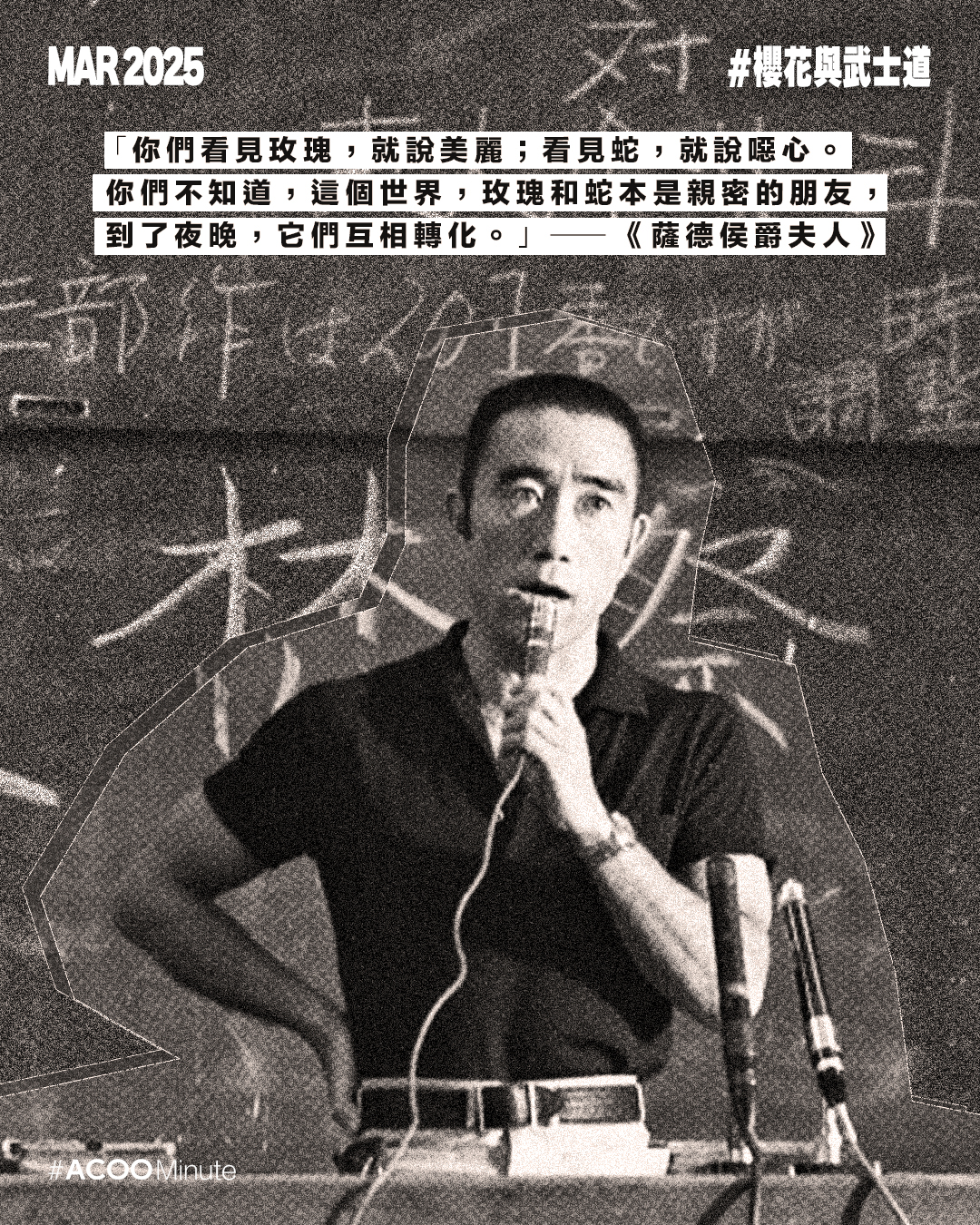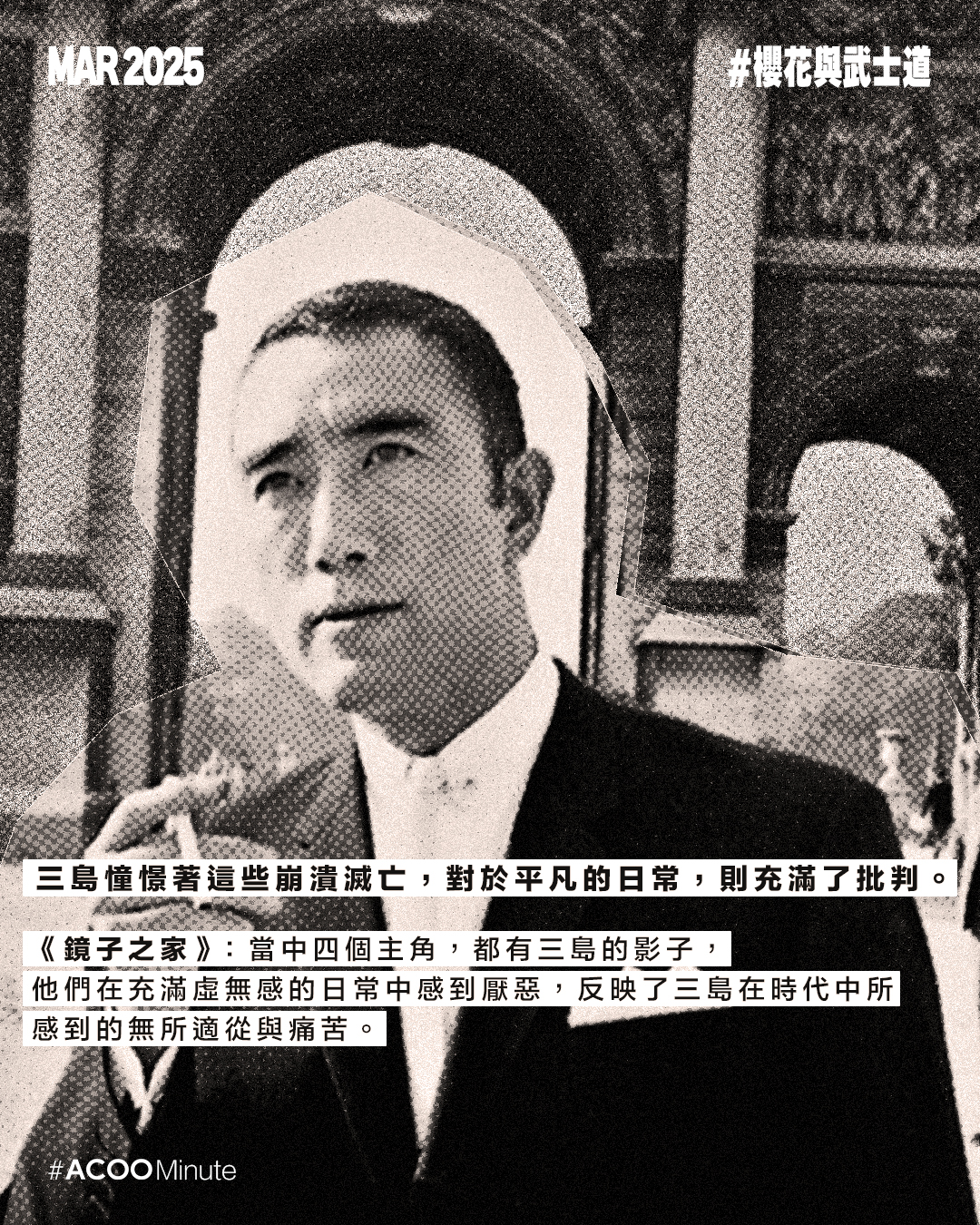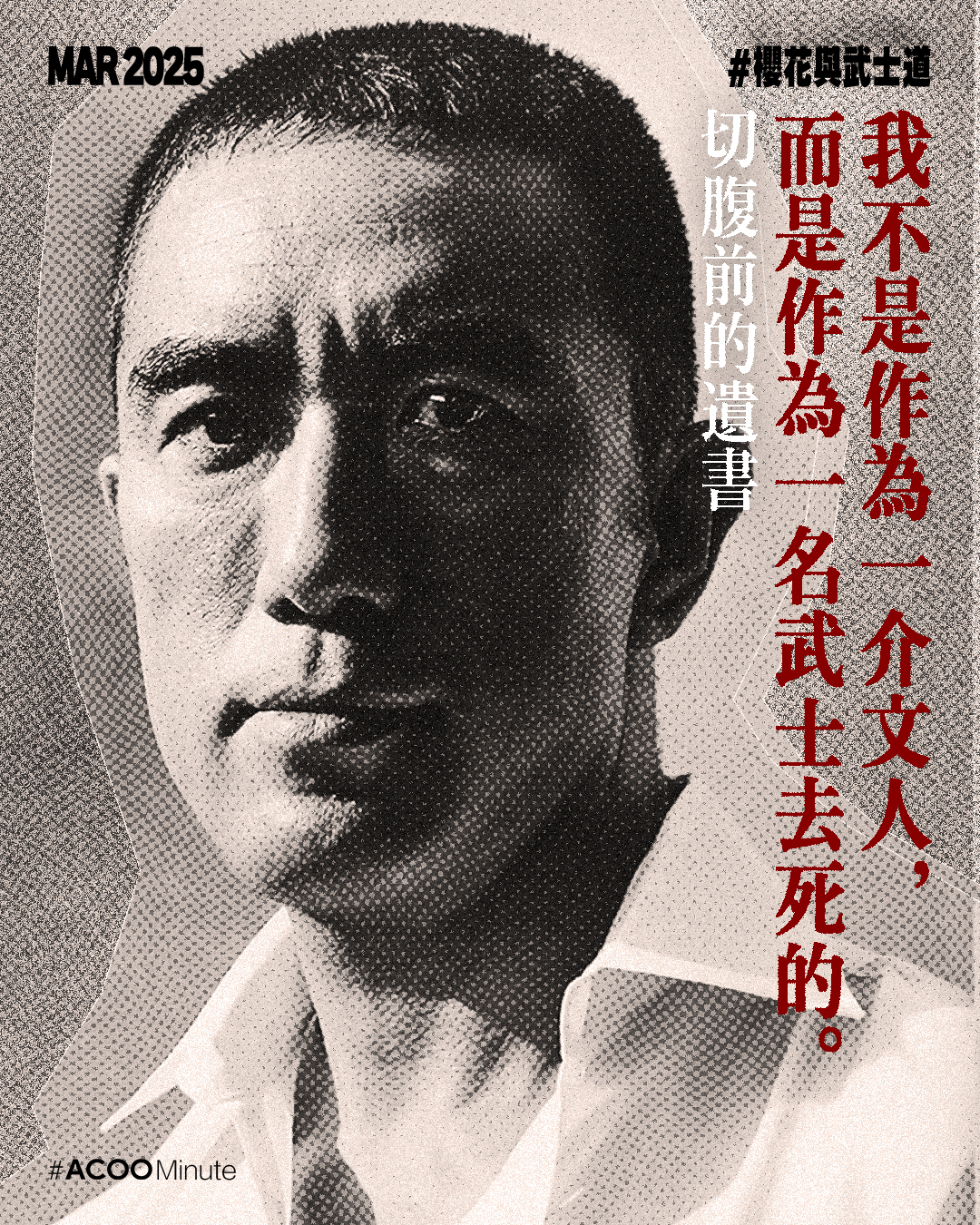 日本戰後文學大師三島由紀夫的一生充滿戲劇性。他在文學界享負盛名,曾三度獲諾貝爾文學獎提名,著有《假面的告白》、《潮騷》、《金閣寺》等經典作品。極度執迷於武士道精神的他,後期投入充滿爭議性的政治活動,最終選擇切腹作為自己的結局,為他戲劇性的一生壯烈落幕。