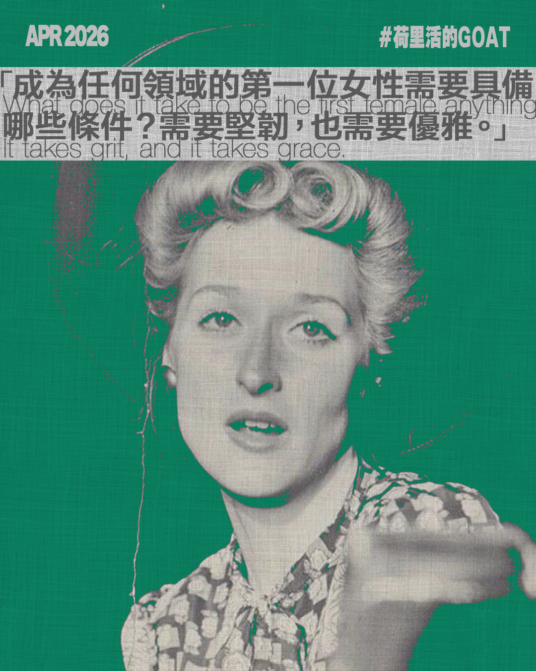 梅麗史翠普一直鼓勵女性不必服從外界的標準,不需要裝可愛或壓抑自己的意見。她亦從未讓外表或年齡框住自己,「面對自以為是的嘲諷、戲謔的輕蔑,或是被無視,都不要放棄,也不要屈服。」當世界試圖定義你的時候,她繼續用實力打破框架,以堅韌和優雅,成為永恆GOAT。