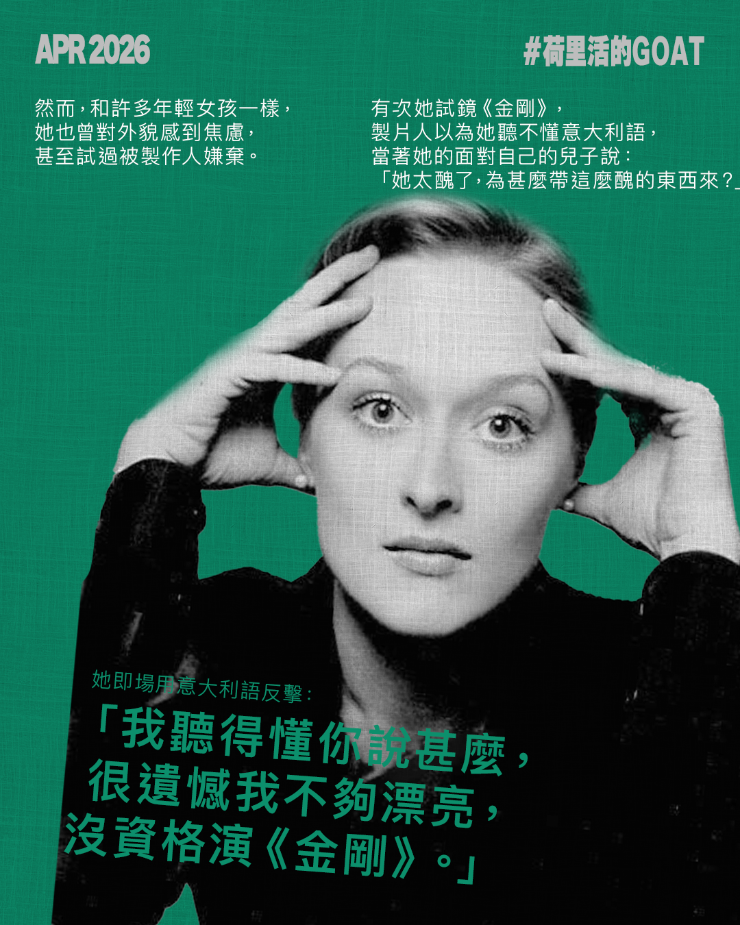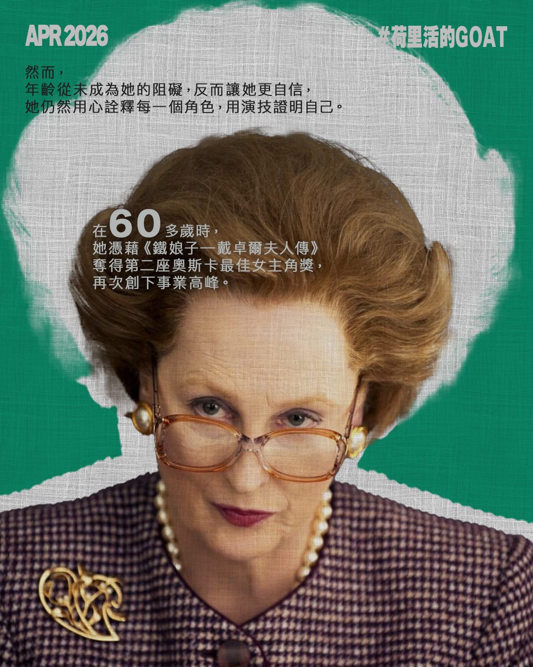 76歲的梅麗史翠普,被荷里活影星稱呼為GOAT(Greatest of All Time),縱橫影壇半世紀,曾21次入圍奧斯卡表演獎,獲得兩座最佳女主角和一座最佳女配角獎。她輕鬆駕馭各類角色,亦擅於掌握不同口音,代表作包括《蘇菲的選擇》、《鐵娘子—戴卓爾夫人傳》與《媽媽咪呀!》等,被網民譽為「地表最強女演員」。