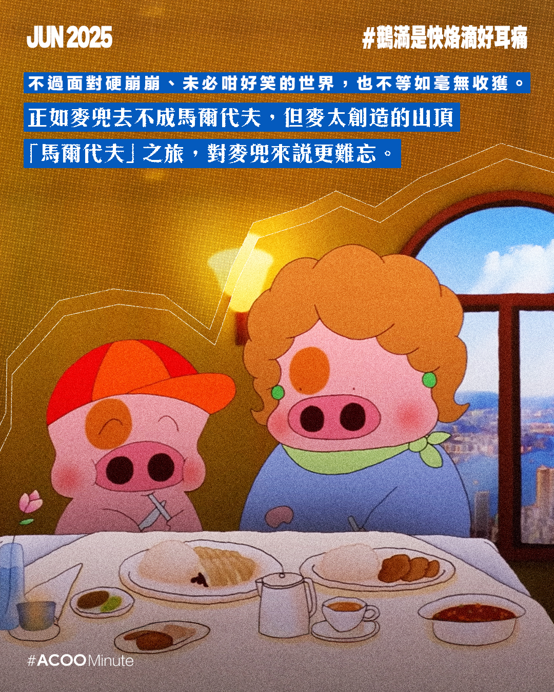 不過面對硬崩崩、未必咁好笑的世界,也不等如毫無收獲。正如麥兜去不成馬爾代夫,但麥太創造的山頂「馬爾代夫」之旅,對麥兜來說更難忘。人生不必太多目的與追求,珍惜眼前的幸福就夠;你也不必做社會棟樑,正如麥太對麥兜說:「你叻仔就最好啦,但如果真係唔叻,我哋兩仔乸,食多嚿雞!」
