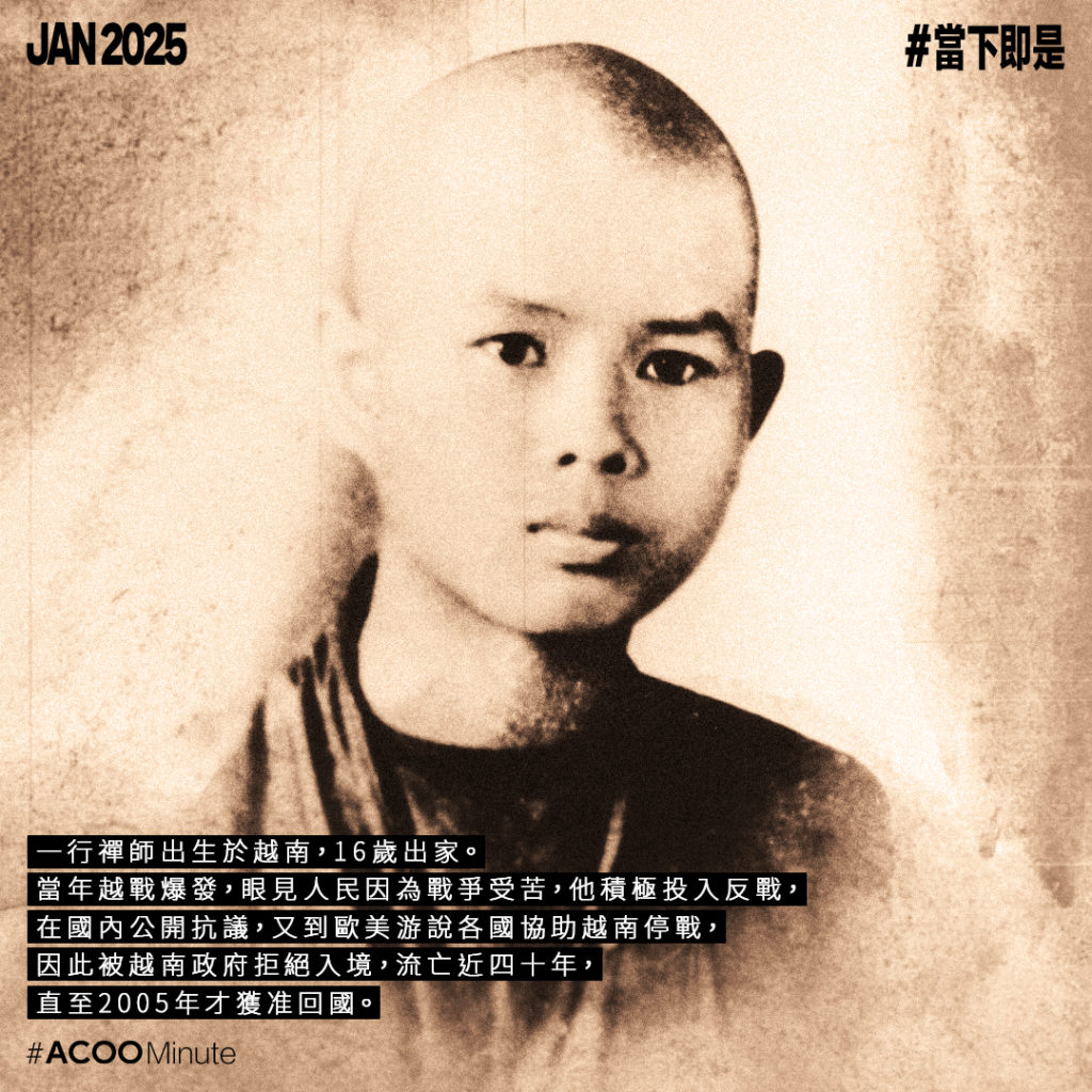 一行禪師出生於越南,16歲出家。當年越戰爆發,眼見人民因為戰爭受苦,他積極投入反戰,在國內公開抗議,又到歐美游說各國協助越南停戰,因此被越南政府拒絕入境,流亡近四十年,直至2005年才獲准回國。他提倡佛教應該入世,積極推動和平,被馬丁路德金提名為諾貝爾和平獎候選人。流亡期間,他將正念修習帶到西方,並在法國成立梅村禪修中心,至今是西方最活躍的佛教道場,每年都吸引來自世界各地的修行者。