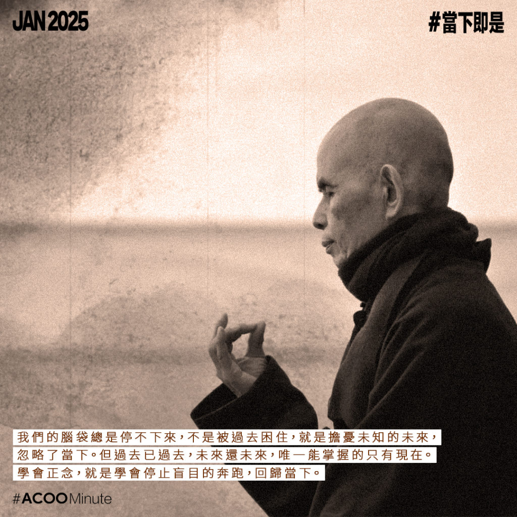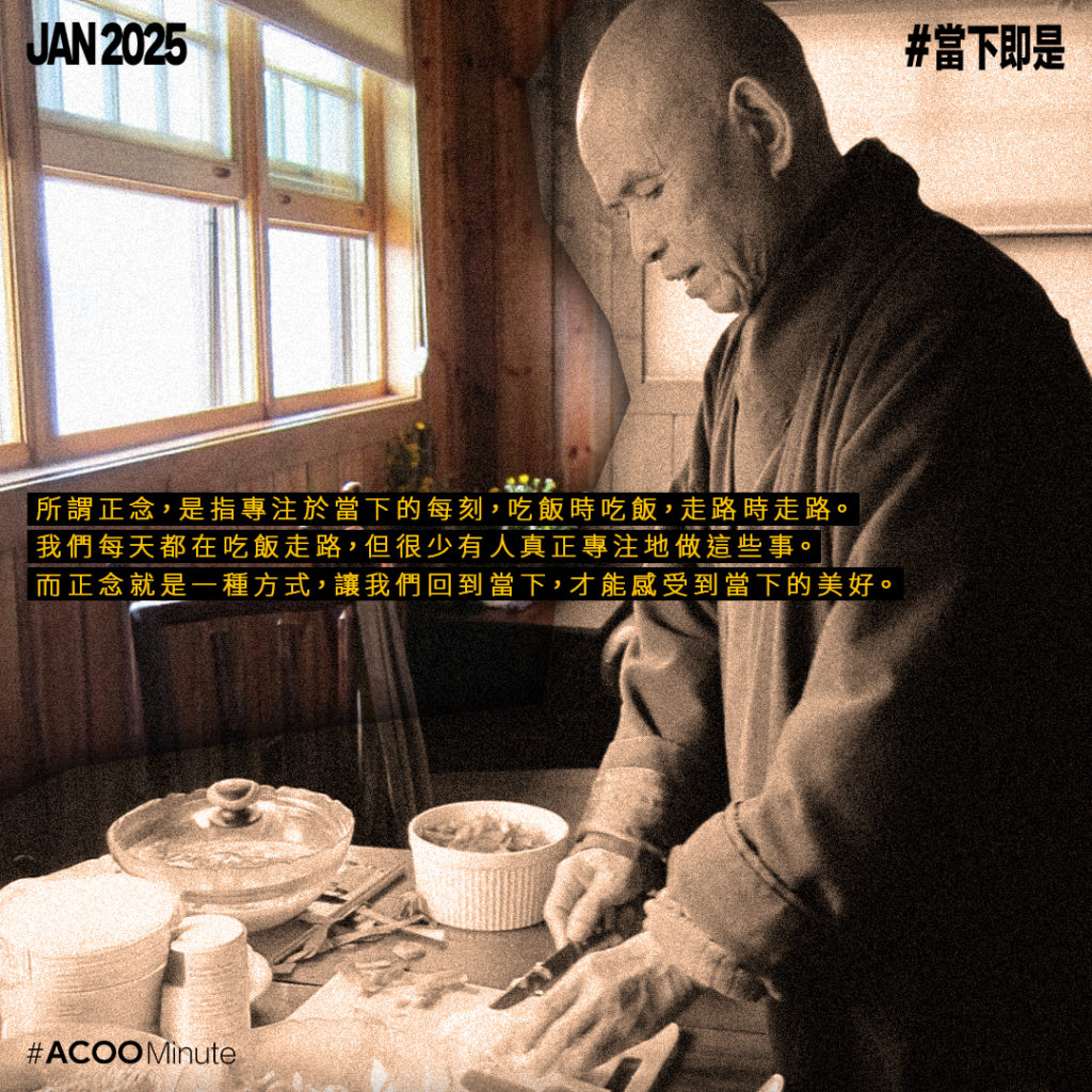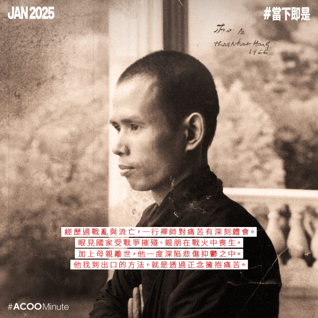 經歷過戰亂與流亡,一行禪師對痛苦有深刻體會。眼見國家受戰爭摧殘、親朋在戰火中喪生,加上母親離世,他一度深陷悲傷抑鬱之中。他找到出口的方法,就是透過正念擁抱痛苦。所謂正念,是指專注於當下的每刻,吃飯時吃飯,走路時走路。我們每天都在吃飯走路,但很少有人真正專注地做這些事。而正念就是一種方式,讓我們回到當下,才能感受到當下的美好。我們的腦袋總是停不下來,不是被過去困住,就是擔憂未知的未來,忽略了當下。但過去已過去,未來還未來,唯一能掌握的只有現在。學會正念,就是學會停止盲目的奔跑,回歸當下。
