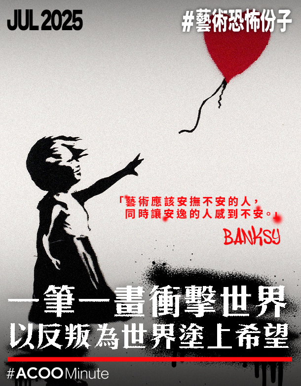 Banksy是現今最神秘的藝術家,全球知名,但無人知曉他的身份。他最著名的創舉,是2018年的拍賣會碎畫事件。當他的代表作《Girl with Balloon》在倫敦蘇富比拍賣行以約千萬港元成交的一刻,畫作在眾目睽睽之下,滑入暗藏在畫框底部的碎紙機,下半部分被碎掉紙條,轟動全球。事後Banksy承認自己策劃這場惡作劇,並將作品命名為《Love is in the Bin》,諷刺拍賣將藝術商品化。Banksy一直以來的作品都蘊含強烈的批判性,顛覆性的手法令他被傳媒稱為「藝術恐怖份子」。他曾引用名言:「藝術應該安撫不安的人,同時讓安逸的人感到不安。」對他來說,挑戰常規,衝擊體制,就是藝術的意義。 Banksy曾獲時代雜誌評為全世界最有影響力的人之一,作品曾在世界各地展出,但數十年來他的真實身份仍然成謎,坊間對他的身份有許多猜測,均未獲證實。他由90年代開始在英國活躍,起初以手繪方式創作,後期轉用模板塗鴉。他的作品充滿黑色幽默,諷刺與批判各種社會議題,展現其反戰、反資本主義的鮮明立場。充滿個人風格的作品,令他很快獲得關注,後來亦開始在不同城市留下作品,在全球走紅。 「當你走進美術館時,你不過是個遊客,遊覽幾位富豪的獎盃櫃。」於他而言,藝術並不是存在於美術館中,而應屬於大眾,因此他堅持將作品展示於街頭。他希望用藝術為世界帶來一點美好,「塗鴉是你一無所有時仍可擁有的工具。即使你無法繪出解決全球貧困的畫作,至少令某人如廁時微笑。」塗鴉也是他表達意見的方式,例如《Shop Till you drop》,就是諷刺消費文化的荒誕。他甚至曾於2005年以巴衝突之時,在以色列與巴勒斯坦之間的隔離牆上創作塗鴉,批評以色列修建隔離牆帶來的隔離與壓迫。 他大膽叛逆而不失幽默的舉動,總能掀起話題。他質疑權威對藝術的界定權,曾將惡搞的蒙羅麗莎畫作偷偷掛在羅浮宮的展牆上,亦試過將自己製作的偽洞穴壁畫偷渡至大英博物館,數天後才被發現。他亦曾打造「暗黑迪士尼樂園」,在英國一個廢棄的海濱公園舉辦了大型展覽《Dismaland》,展示圍繞社會議題的裝置作品,告訴大家真實世界並不如迪士尼描寫的夢幻。 Banksy是國王的新衣中的小孩,撕下社會的遮醜布,提醒大家面對真實。成人世界充滿規則和限制,對於現況習慣妥協;Banksy卻說「跳出框框,拆毀框架,再以利刃將其剖開。」因為拒絕被馴服,他的創作才能保留頑童般的叛逆,提醒大家還可以對世界多點想像,任意在天空建造城堡。 文字:林三 @lam.three 設計:Po @p12_o28 -------------------- In ACOO, you can get refreshed in #ACOOMinute.
