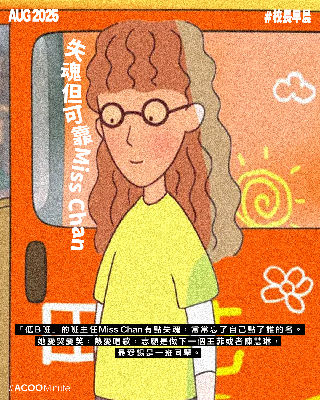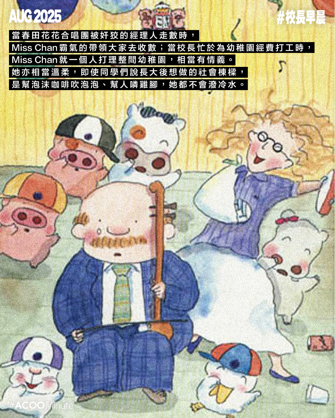 「低B班」的班主任Miss Chan有點失魂,常常忘了自己點了誰的名。她愛哭愛笑,熱愛唱歌,志願是做下一個王菲或者陳慧琳,最愛錫是一班同學。當春田花花合唱團被奸狡的經理人走數時,她霸氣的帶領大家去收數;當校長忙於為幼稚園經費打工時,Miss Chan就一個人打理整間幼稚園,相當有情義。她亦相當溫柔,即使同學們說長大後想做的社會棟樑,是幫泡沫咖啡吹泡泡、幫人噒雞腳,她都不會潑冷水。